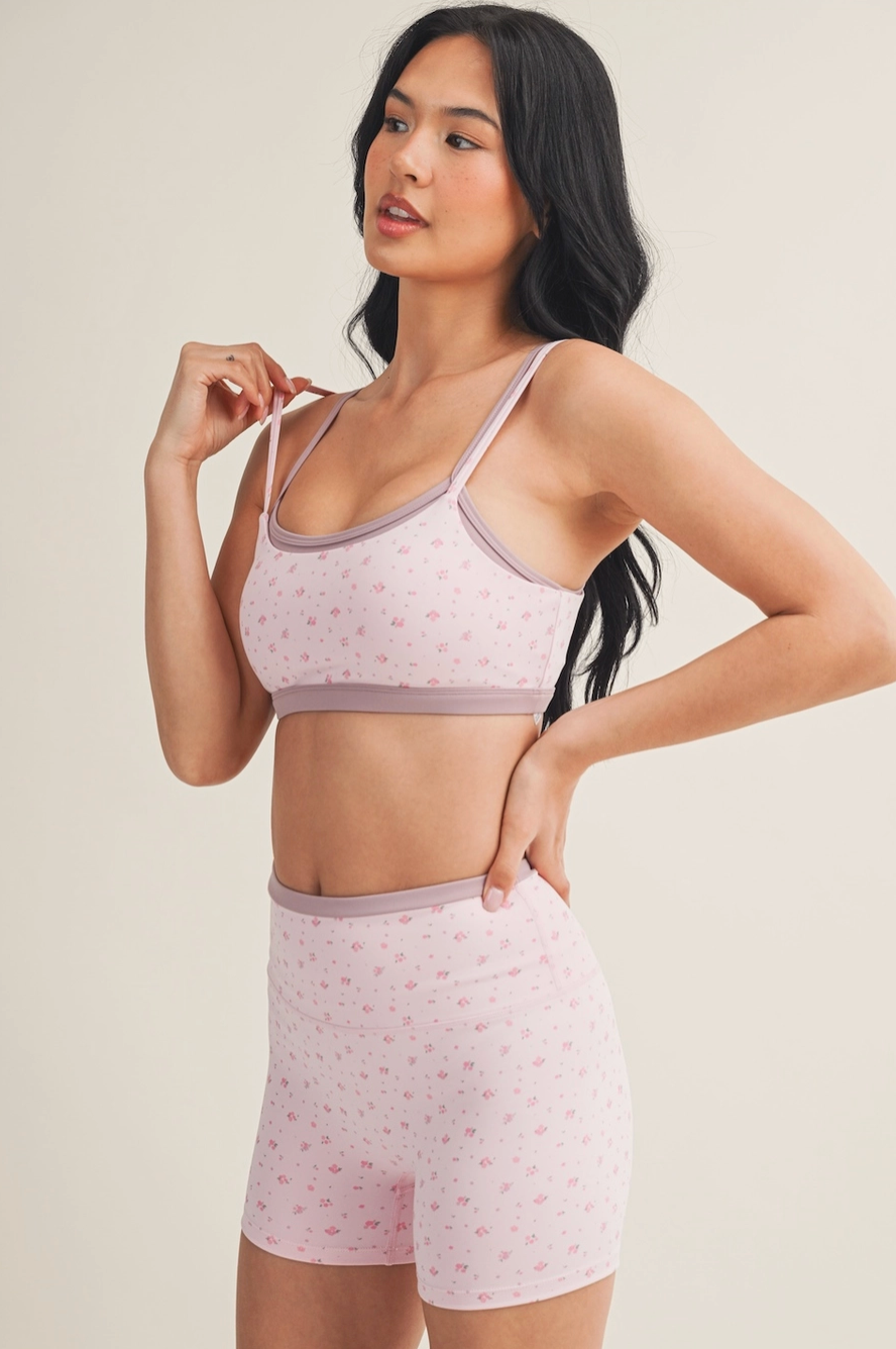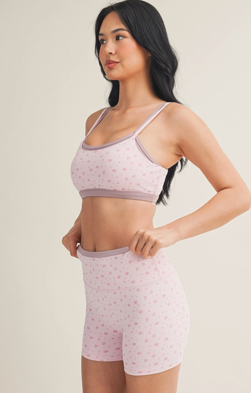 The Ditsy Flower Active Bra Top is the perfect blend of feminine and functional. Designed with a soft blush base and delicate ditsy floral print, this lightweight athletic top features adjustable straps and a smooth stretch fit for comfortable support. Pair it with the matching biker shorts for an effortlessly cute active set.