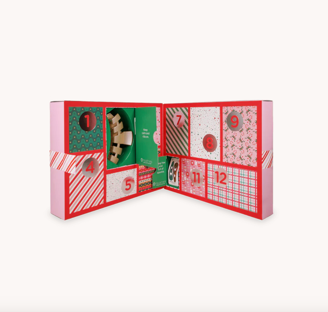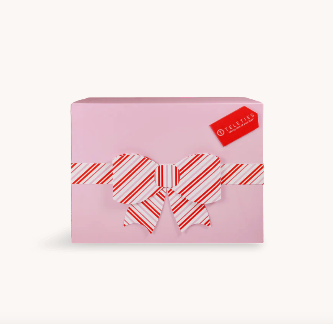 Count down to Christmas with the Teleties 12 Days of Cheer Advent Calendar! Unwrap 12 festive surprises featuring a $100 value of hair ties, clips, and accessories in limited-edition holiday styles. Each day reveals a new treat in a beautifully wrapped pink and candy-striped box—perfect for gifting or keeping for yourself!