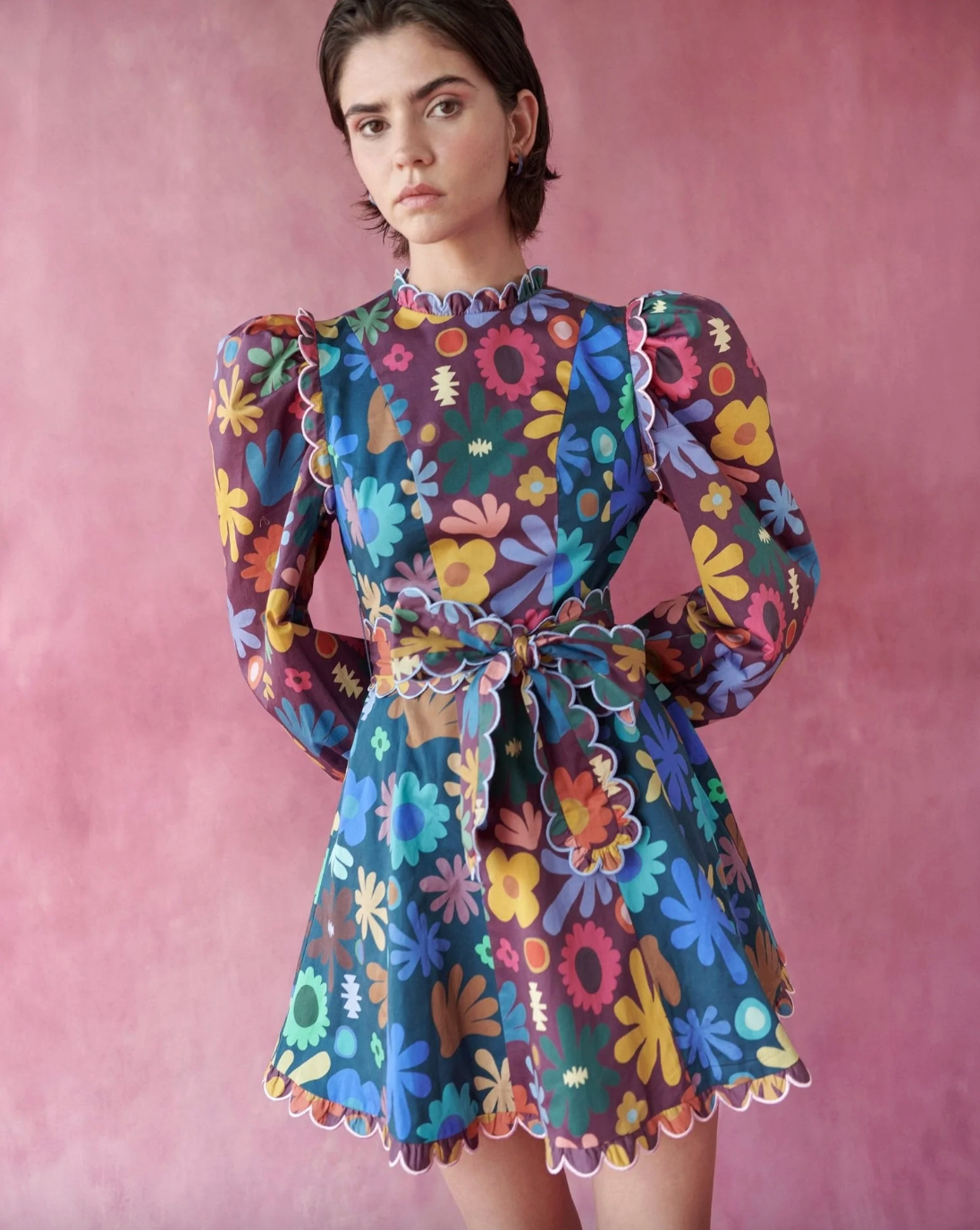 Fun, flirty, and full of personality. The Gozo Mini Dress features a bold retro floral print with scalloped trim, puff sleeves, and a removable waist tie. The A-line mini skirt adds playful movement—perfect for parties, date nights, and standout moments.