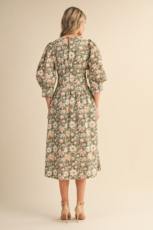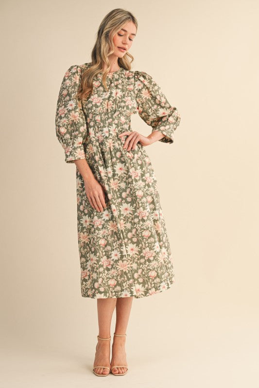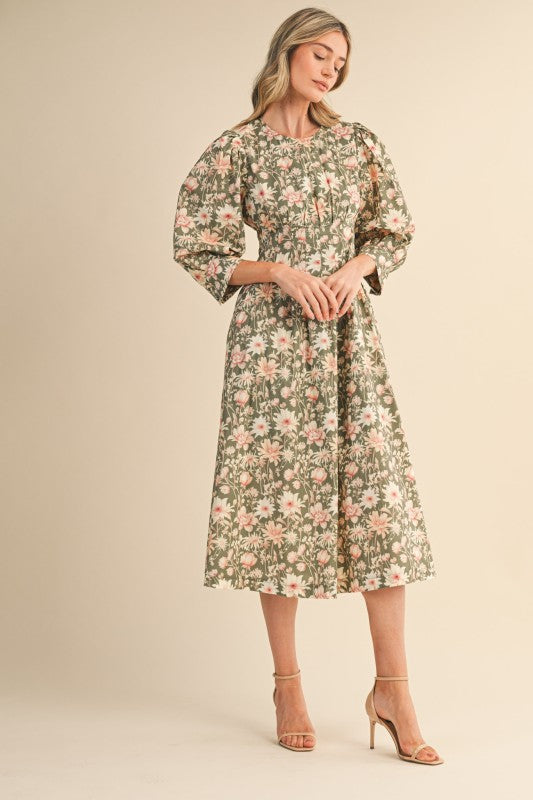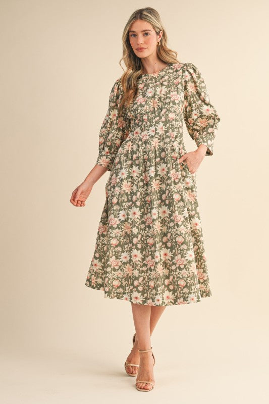 Effortlessly feminine with vintage-inspired florals, this sage and blush midi features puff sleeves, a cinched waist, and hidden side pockets for a charming, timeless look.
