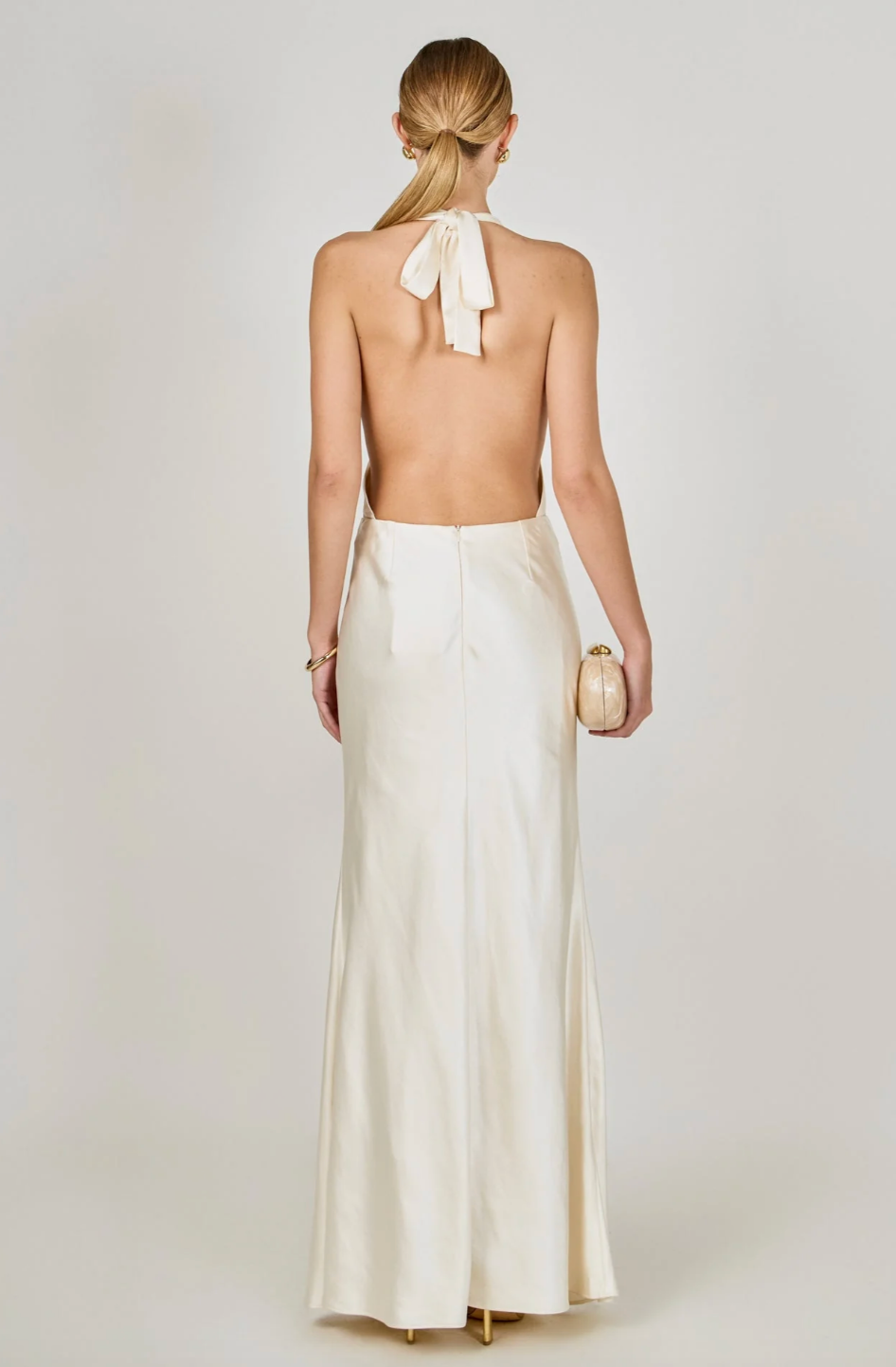 An effortlessly elegant maxi with a silky drape and open-back moment. The cowl neckline and halter tie create a soft, flattering shape that’s perfect for special occasions.