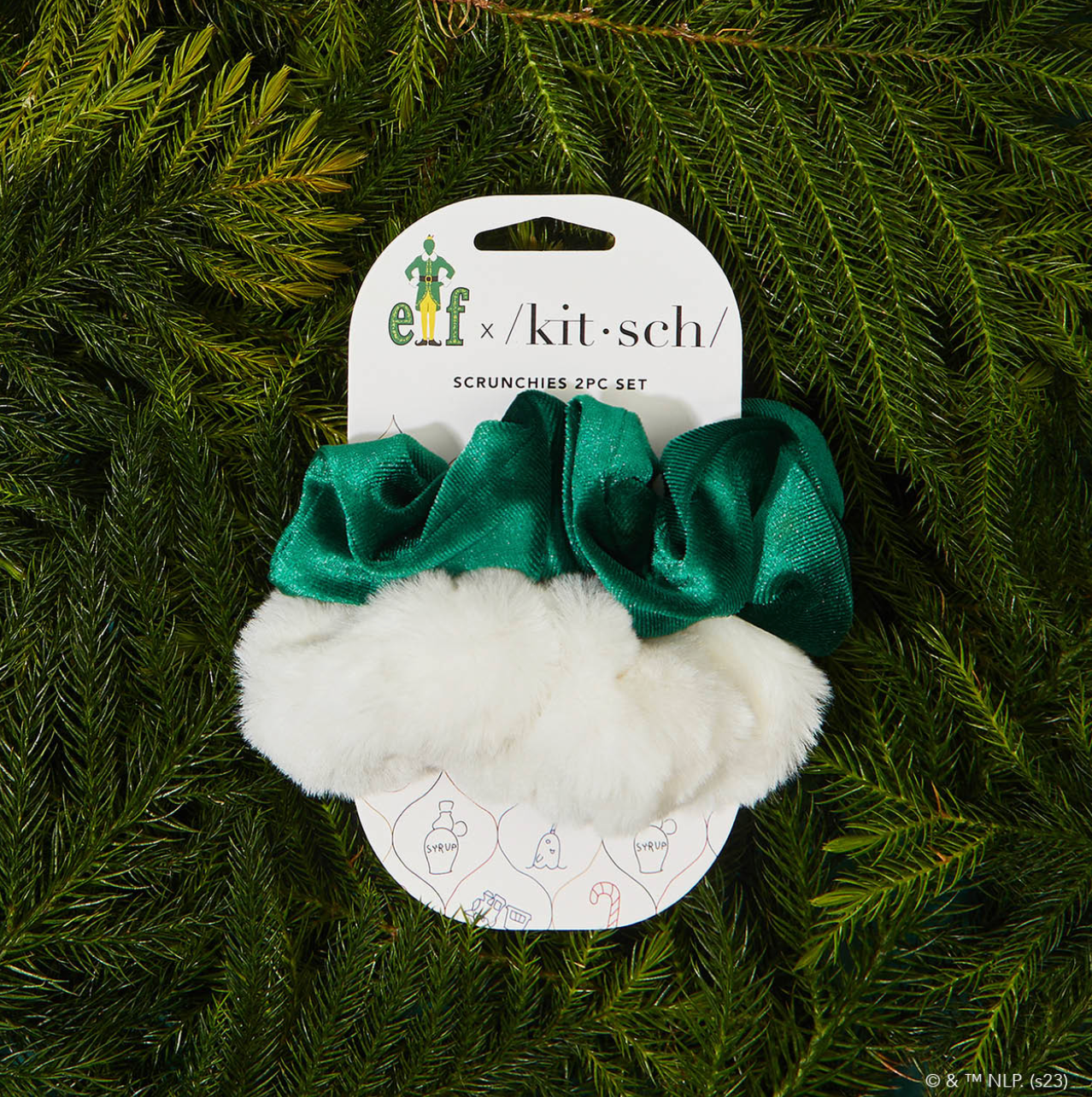 Spread some holiday cheer with the Kitsch x Elf Scrunchies 2pc Set. Inspired by Buddy the Elf’s iconic look, this festive duo includes a silky green scrunchie and a plush white faux fur one—perfect for adding a merry touch to your updos, buns, and ponytails. Whether you’re cozying up with cocoa or heading out to spread Christmas cheer, these scrunchies bring a dash of playful holiday spirit to every hairstyle.