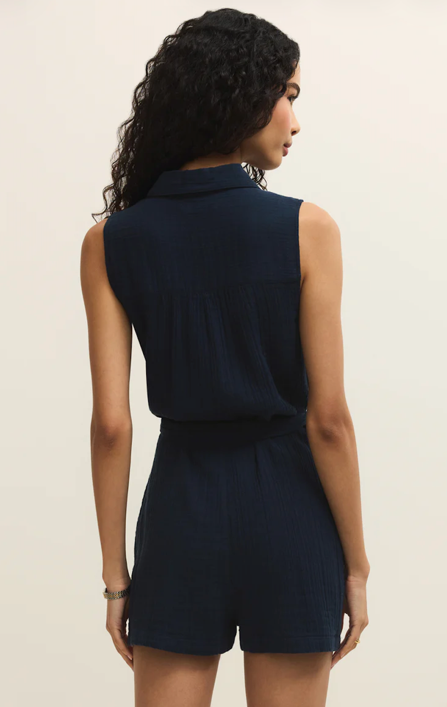 An easy warm-weather romper in a deep eclipse navy crafted from Z Supply’s signature lightweight gauze. Featuring a collared button front, relaxed sleeveless fit, and a self-tie waist for a flattering shape. Effortless, breathable, and perfect for sunny days.