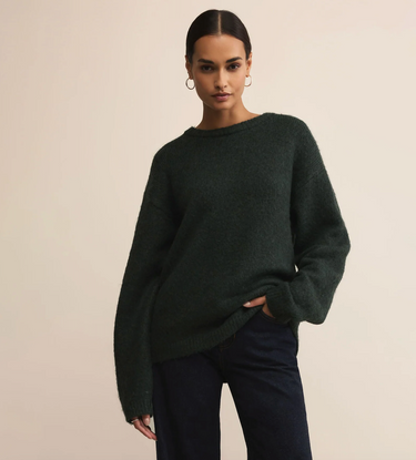Woman wearing a Z Supply snowed in sweater with drop shoulders in garland green. Woman wearing a Z Supply snowed in sweater with drop shoulders in garland green.