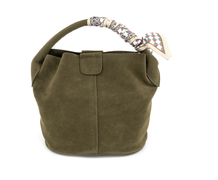 A cozy-chic twist on the everyday carryall. The Sienna Suede Bucket Bag blends effortless structure with soft suede textures and a playful printed scarf-wrapped handle for just the right pop of charm.