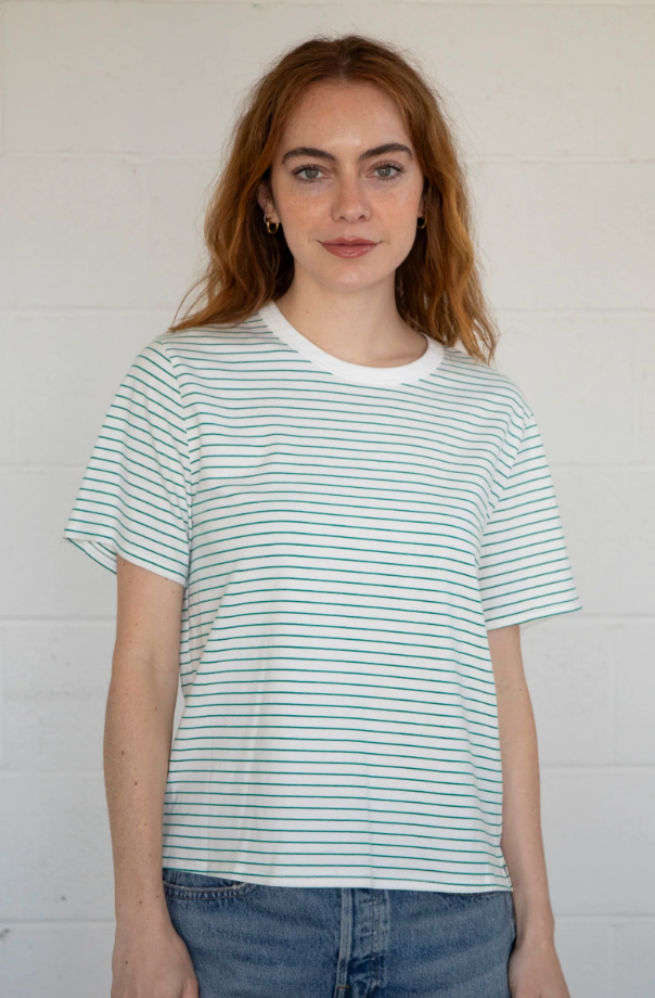 A fresh take on a classic. The Rowan Striped Tee features a timeless crew neckline, short sleeves, and a relaxed fit in lightweight cotton. The crisp white base with thin green stripes makes it an easy everyday piece—perfect for layering or wearing on its own.