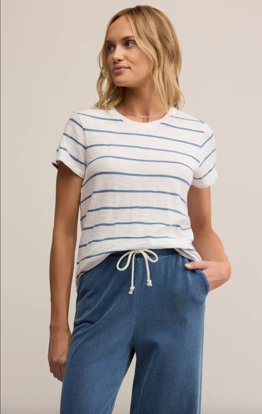 Fresh, light, and endlessly wearable, the Z Supply Foundation Striped Tee in Boat House is your go-to for laid-back days and casual-chic style. Made from a soft, breathable cotton-blend knit, this timeless tee features crisp blue horizontal stripes on a clean white backdrop. The relaxed fit, short sleeves, and classic crew neckline make it an easy piece to pair with anything from lounge joggers to your favorite denim. Side slits at the hem add a touch of movement, keeping the fit comfortable and flattering all day long.