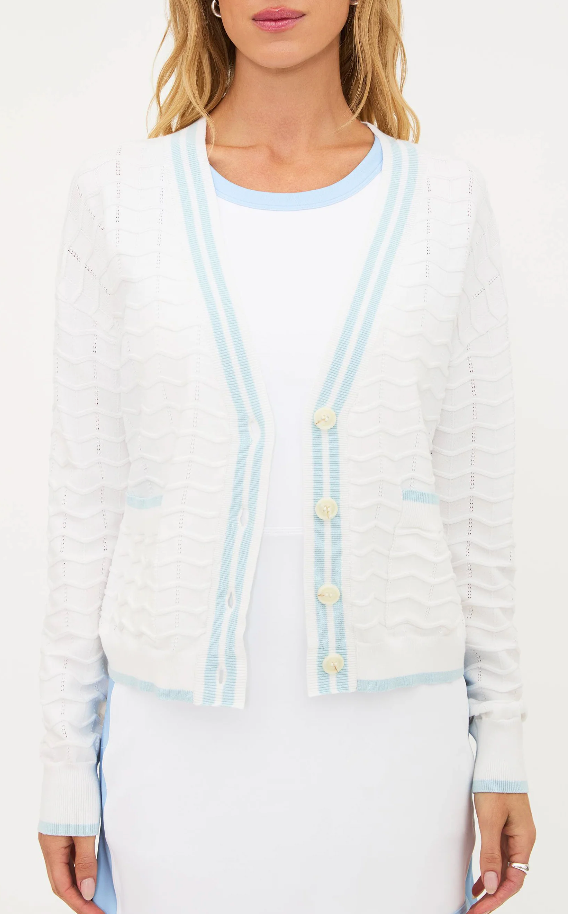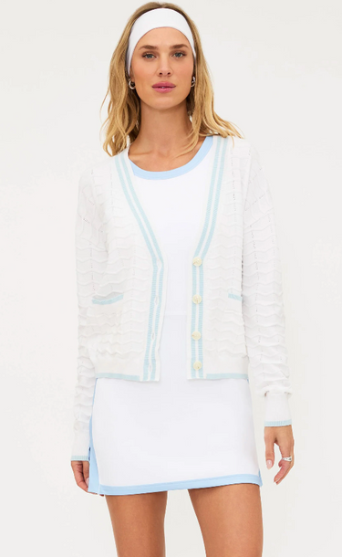 The Gene Cardigan by Beach Riot is the perfect lightweight layer to elevate your sporty-chic look. Designed in a breezy open-knit with a subtle chevron texture, this cardigan features a fresh coastal white base accented with soft blue trim for a preppy, tennis-inspired vibe. The front button closure with pearly buttons and two small pockets add timeless charm while keeping it functional. Its relaxed fit makes it easy to toss on over activewear, dresses, or swim, making it a versatile piece for everything from the court to cocktails.