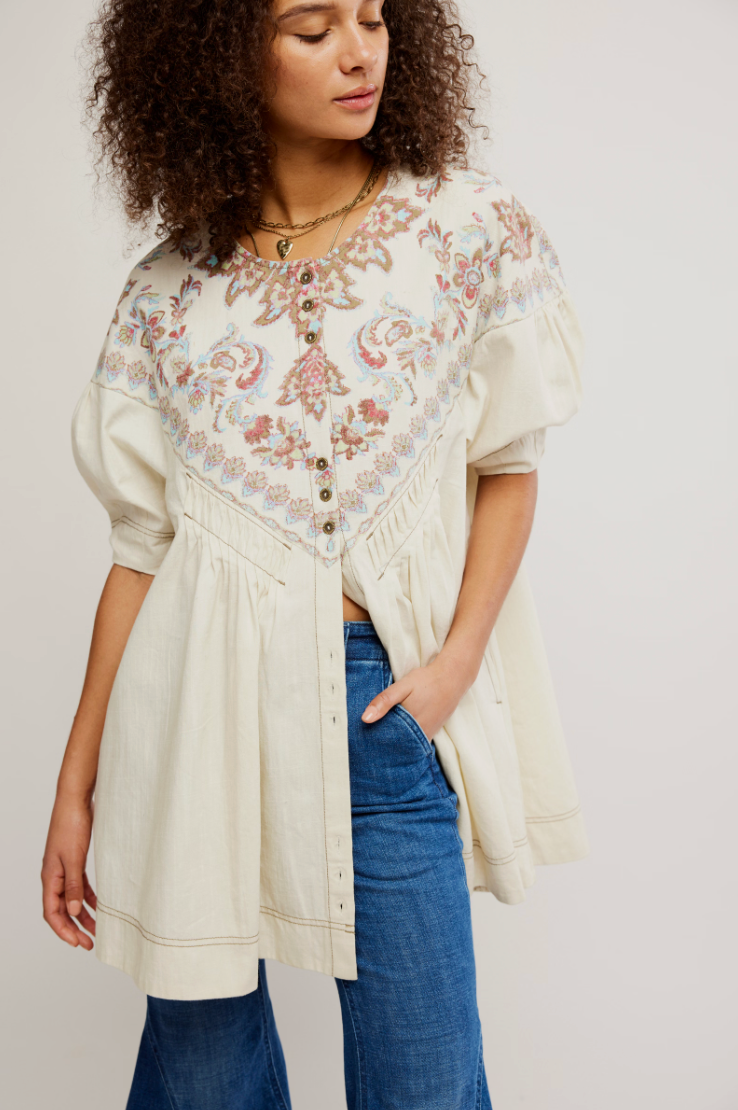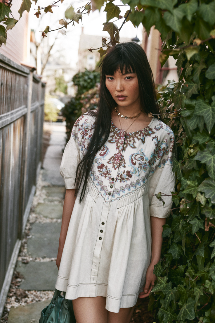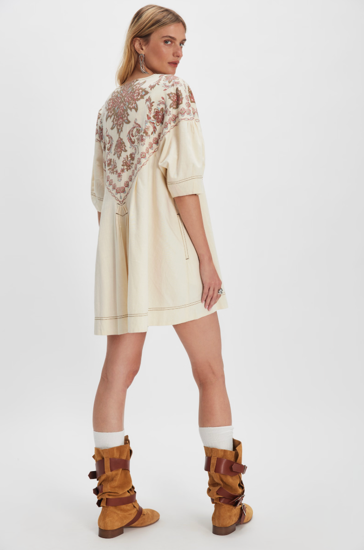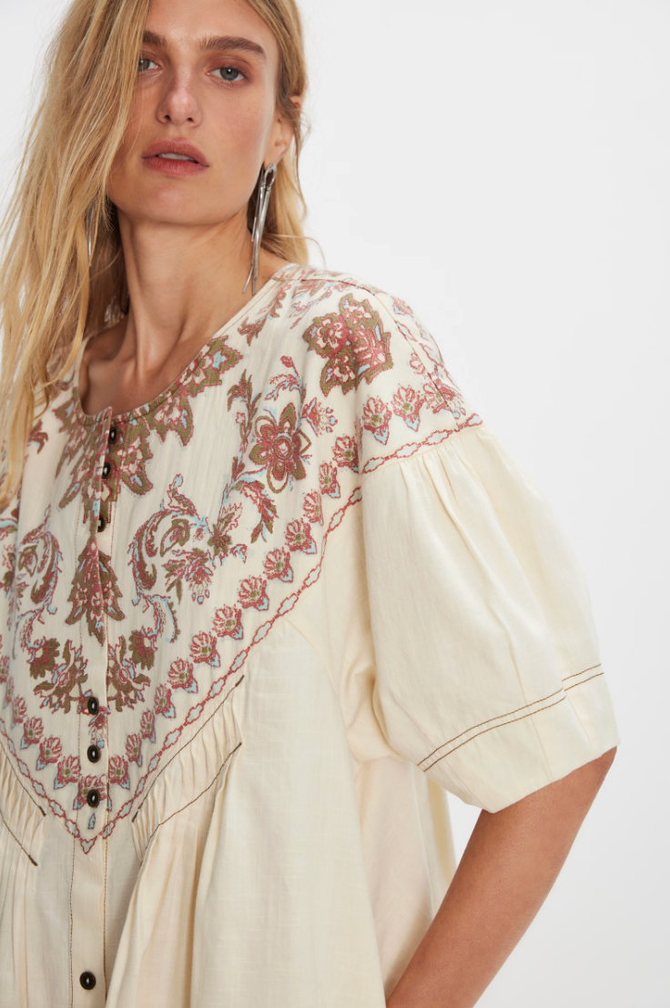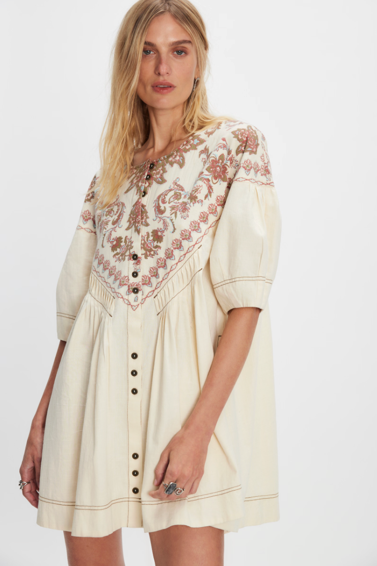 Boho charm meets timeless ease in the Orson Mini Dress. Designed with an airy, relaxed fit, this cream-toned mini features intricate floral embroidery across the chest and shoulders for an artisan-inspired touch. The pleated front and button detailing give it a structured yet flowy silhouette, while the puff sleeves add just the right amount of volume. Effortless and versatile, it’s the piece you’ll want to wear from festivals to weekends in the city.