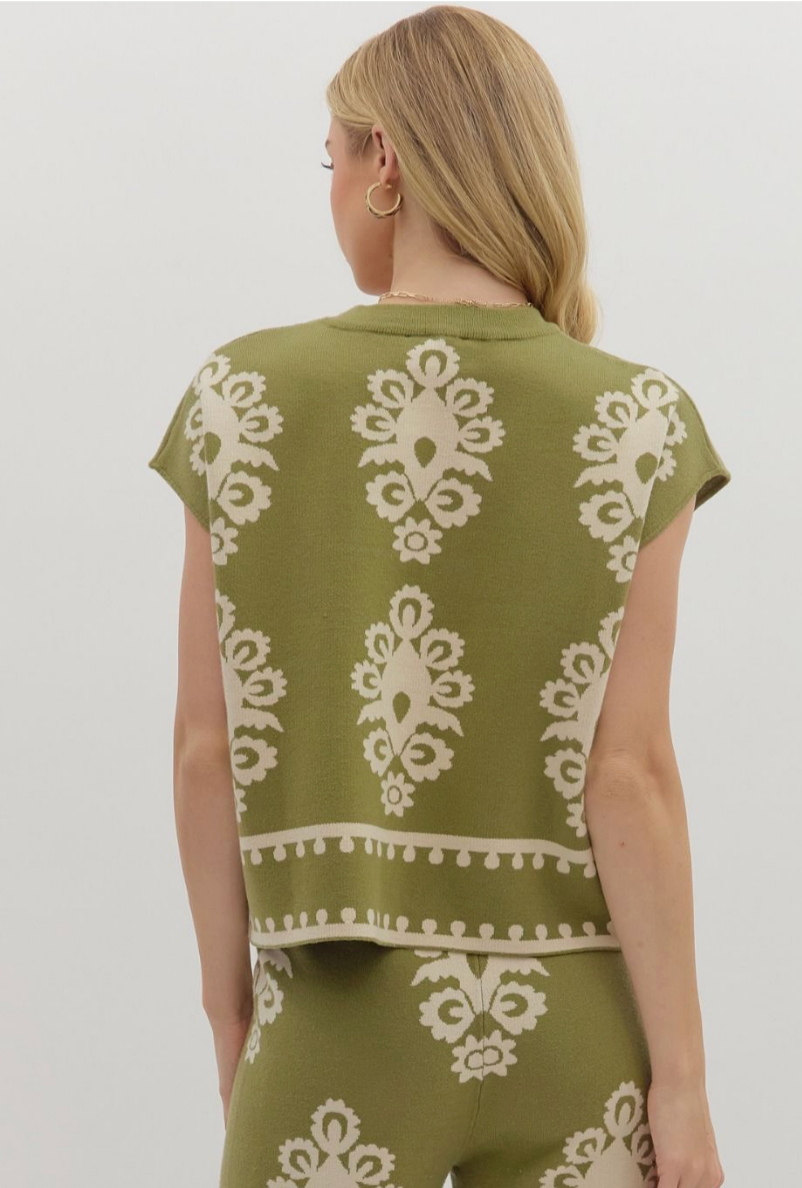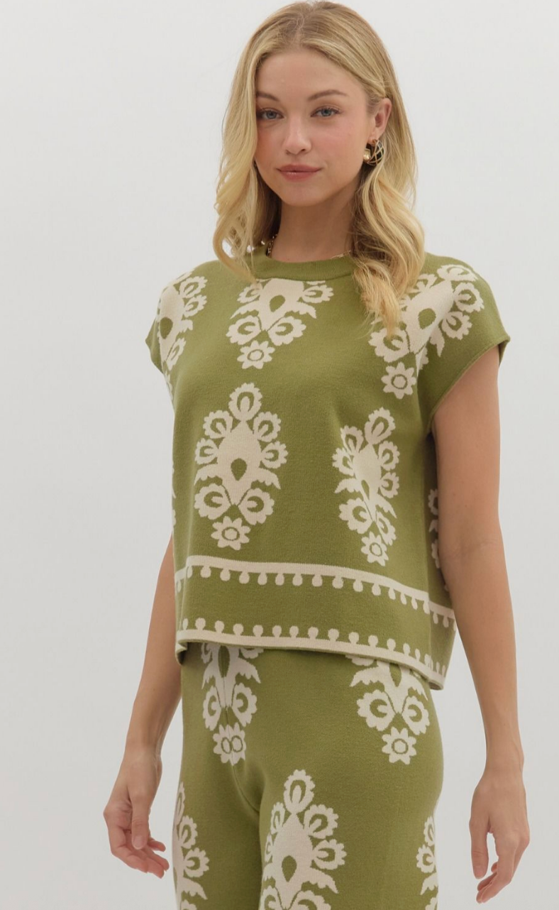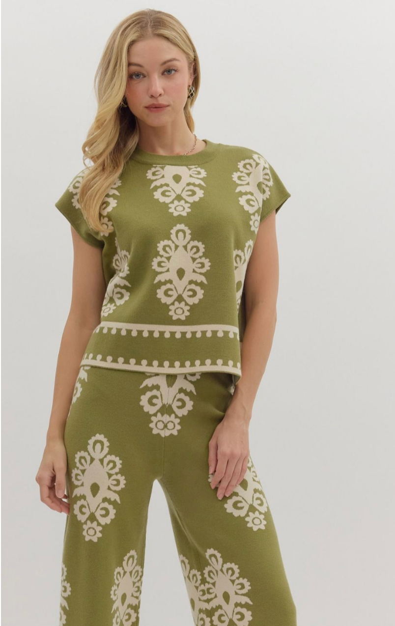 DAMASK PATTERN KNIT PULLOVER TOP IN OLIVE