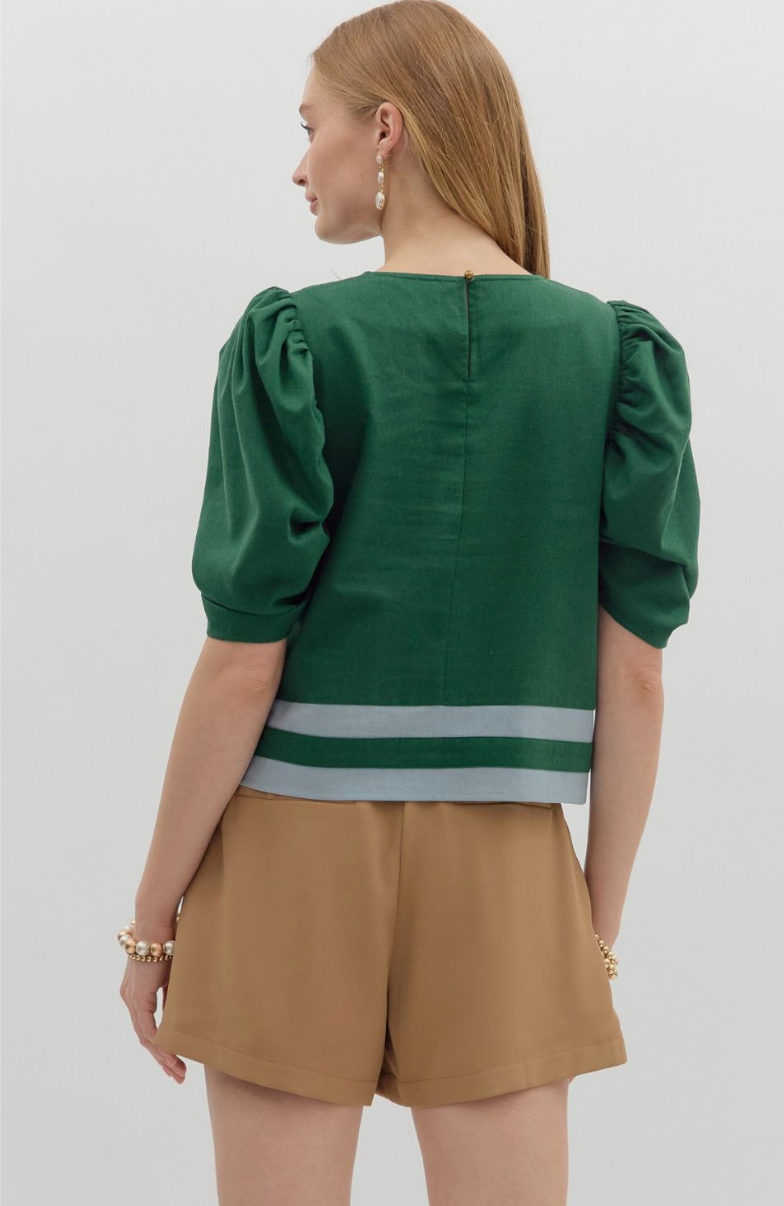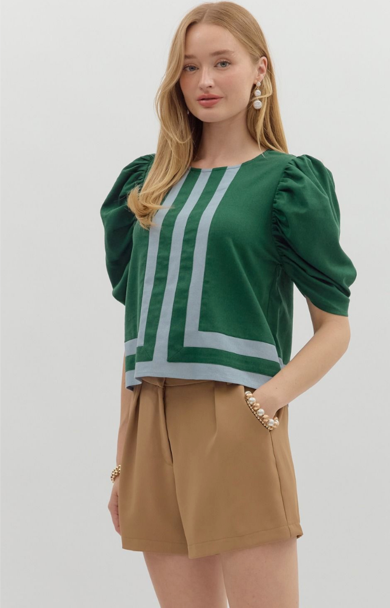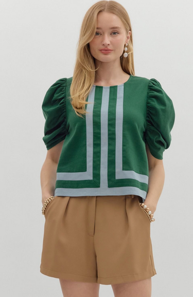 A modern statement piece for the bold and stylish, this hunter green puff sleeve top brings together elegant structure and graphic charm.