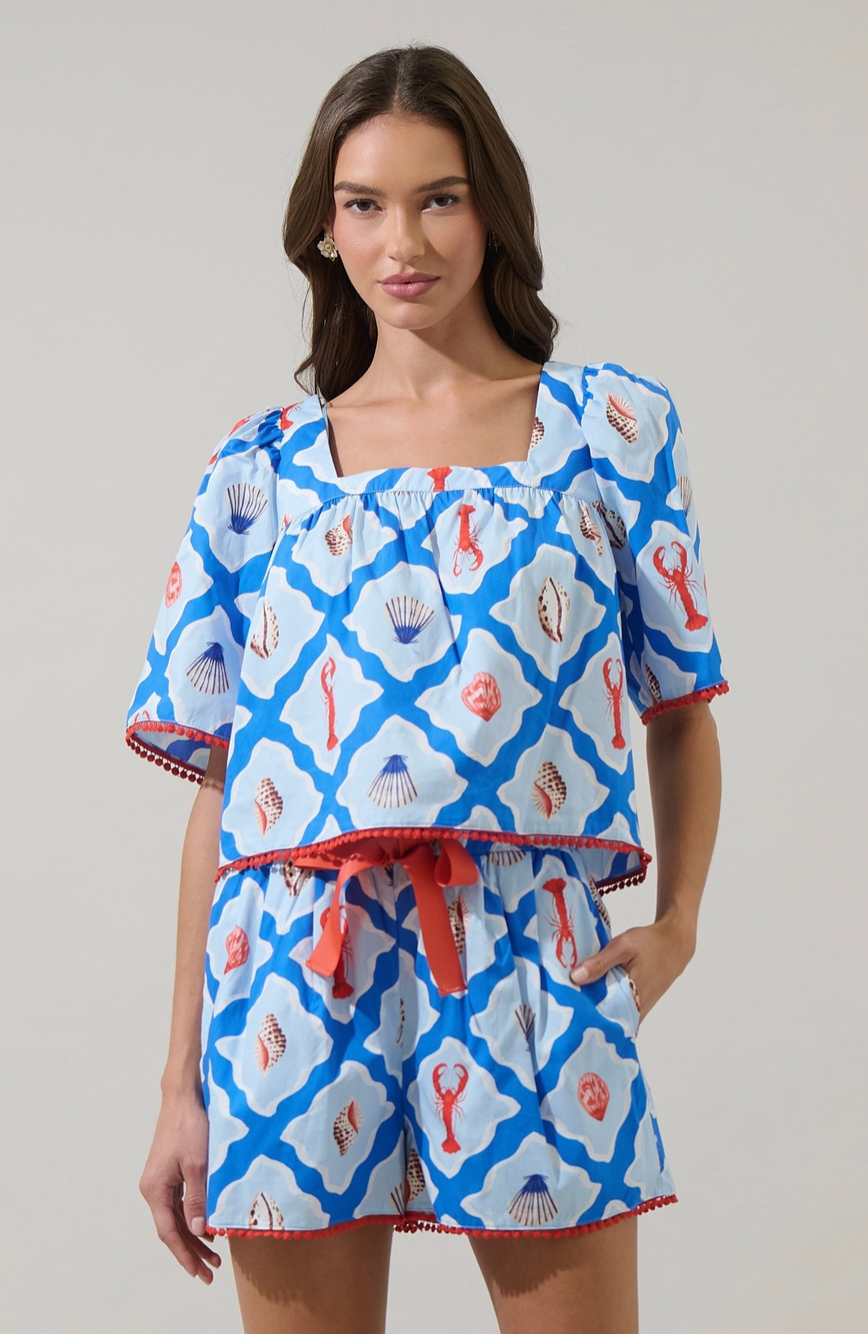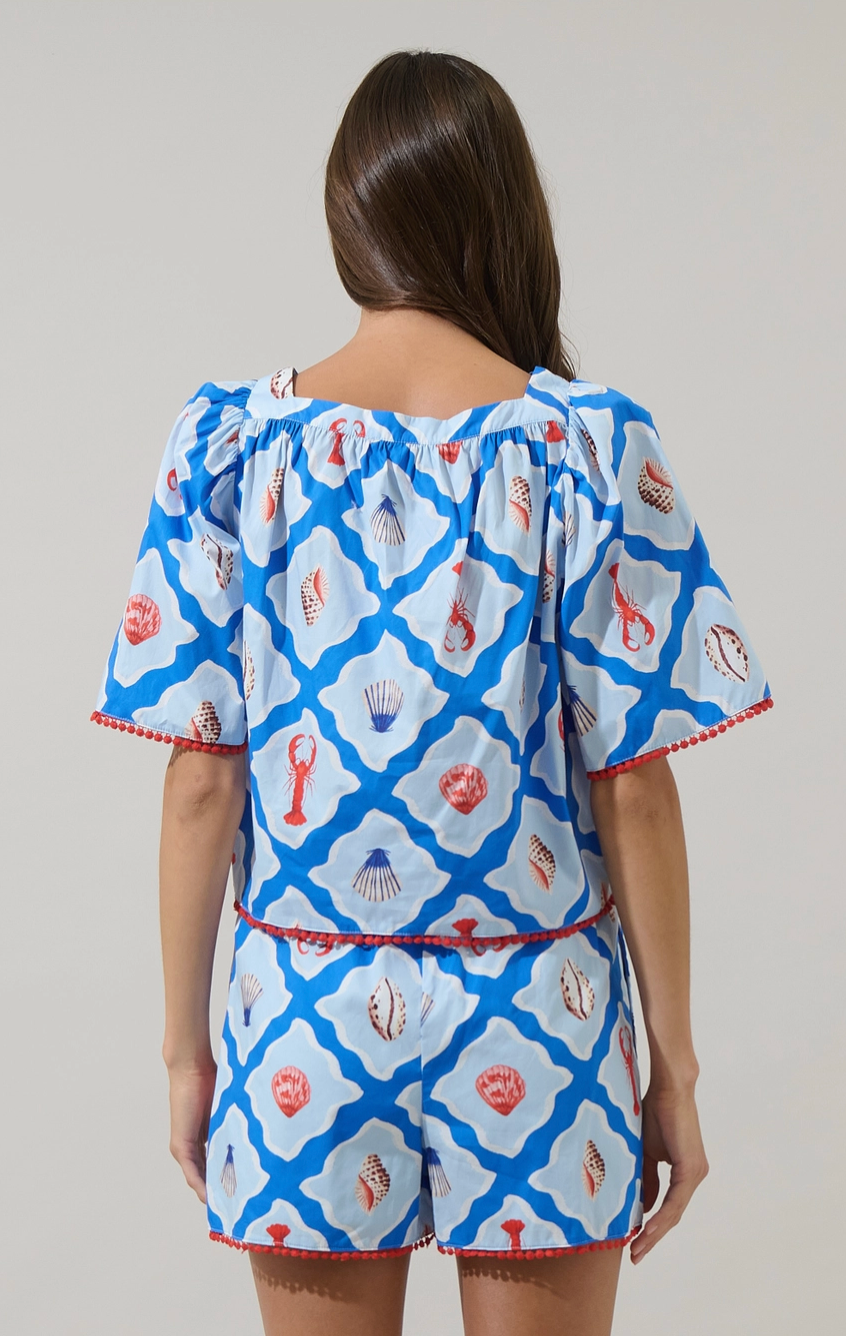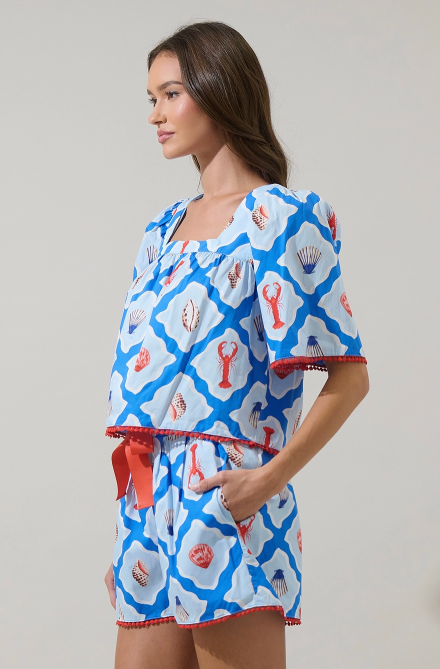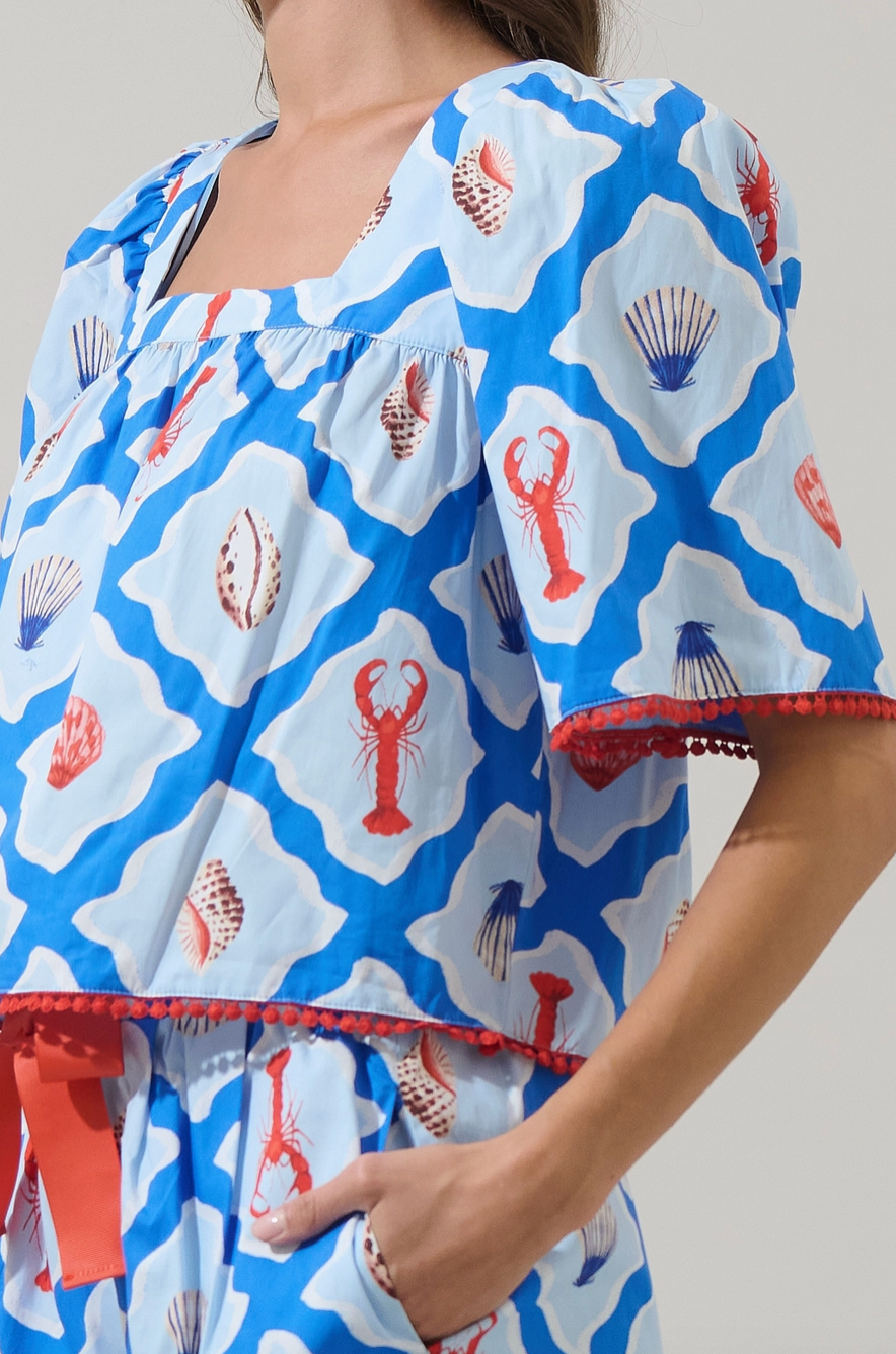 Bright, breezy, and full of coastal charm, the Lobster Bay Burmy Bell Sleeve Top is the definition of playful summer style. Featuring a bold blue geometric print with whimsical lobsters and seashells, this top is designed with a flattering square neckline and relaxed, bell-style sleeves trimmed in contrast pom-pom detailing. Easy, airy, and endlessly fun, it’s made for sunny days and seaside moments.