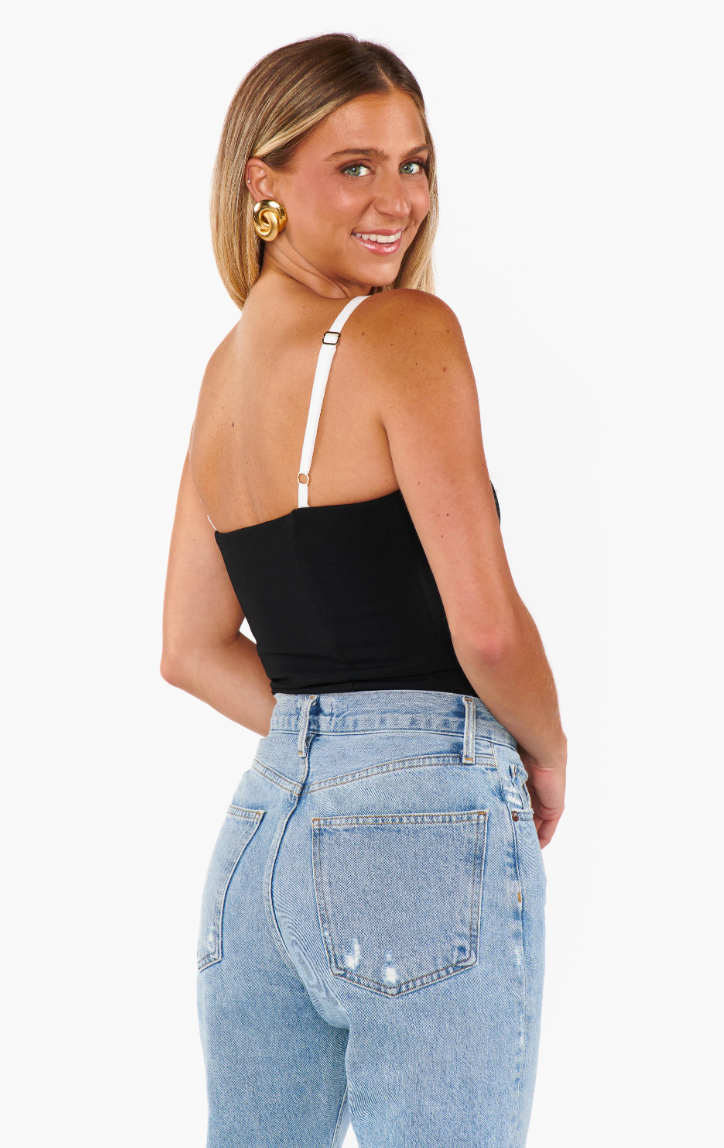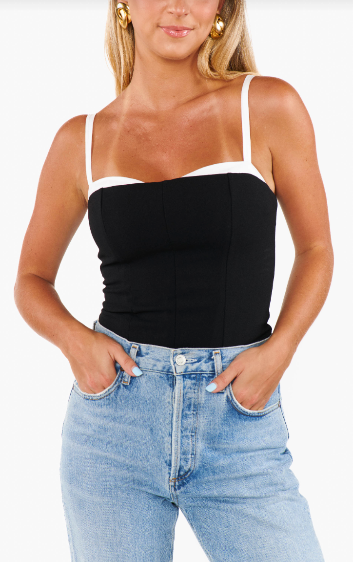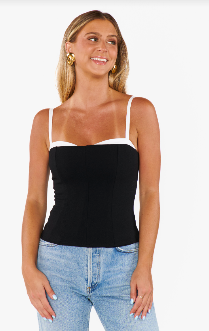 Chic and timeless, the Tiff Top is the ultimate versatile piece for your wardrobe. With its sleek black bodice framed by crisp white straps and neckline, this fitted top offers a clean, tailored look that pairs effortlessly with everything from high-waisted denim to flowy skirts. The structured design flatters the silhouette while the adjustable straps ensure a perfect fit every time.