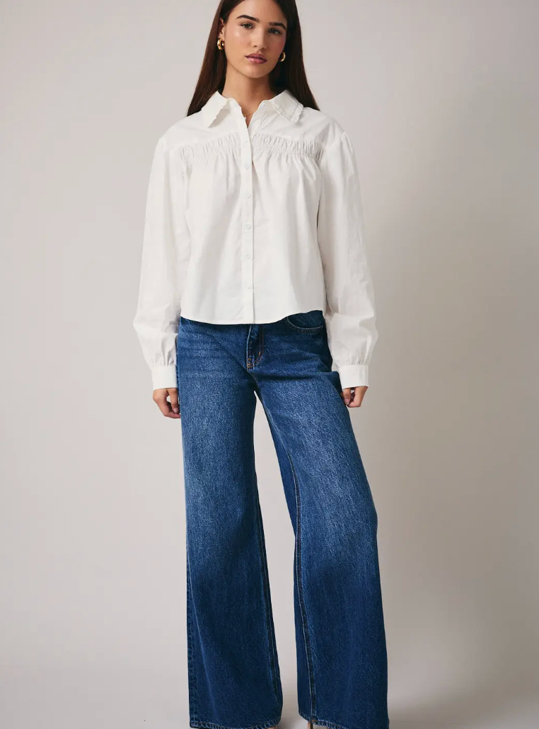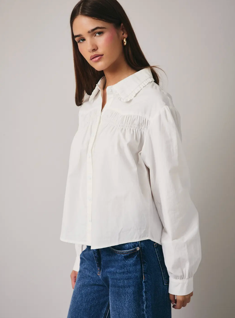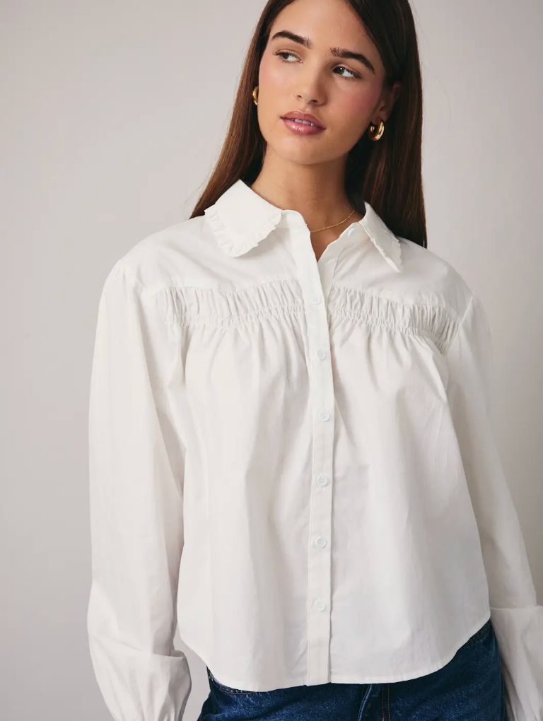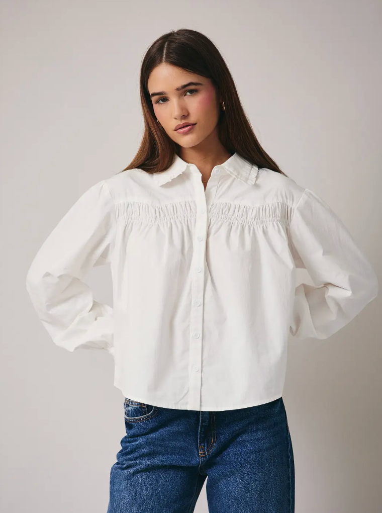 Effortless and refined, the Willa Smocked Button-Down Top brings a fresh take on a classic white blouse. Designed with delicate smocking across the front and back yoke, this top adds soft texture and feminine interest while maintaining a clean, polished look. The relaxed silhouette, slightly cropped length, and gently voluminous sleeves make it an easy pairing with high-rise denim or tailored trousers. A timeless staple that transitions seamlessly from everyday wear to elevated occasions.