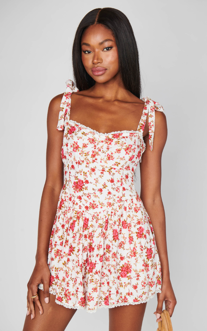 Sweet and southern-chic, the Regal Romper in Southern Roses brings flirty charm to any warm-weather outing. With its dainty red floral print on crisp white, tie-shoulder straps, and scalloped trim, this romper blends feminine details with everyday ease. The smocked back ensures a comfortable fit, while the flowy shorts keep it playful and breezy.