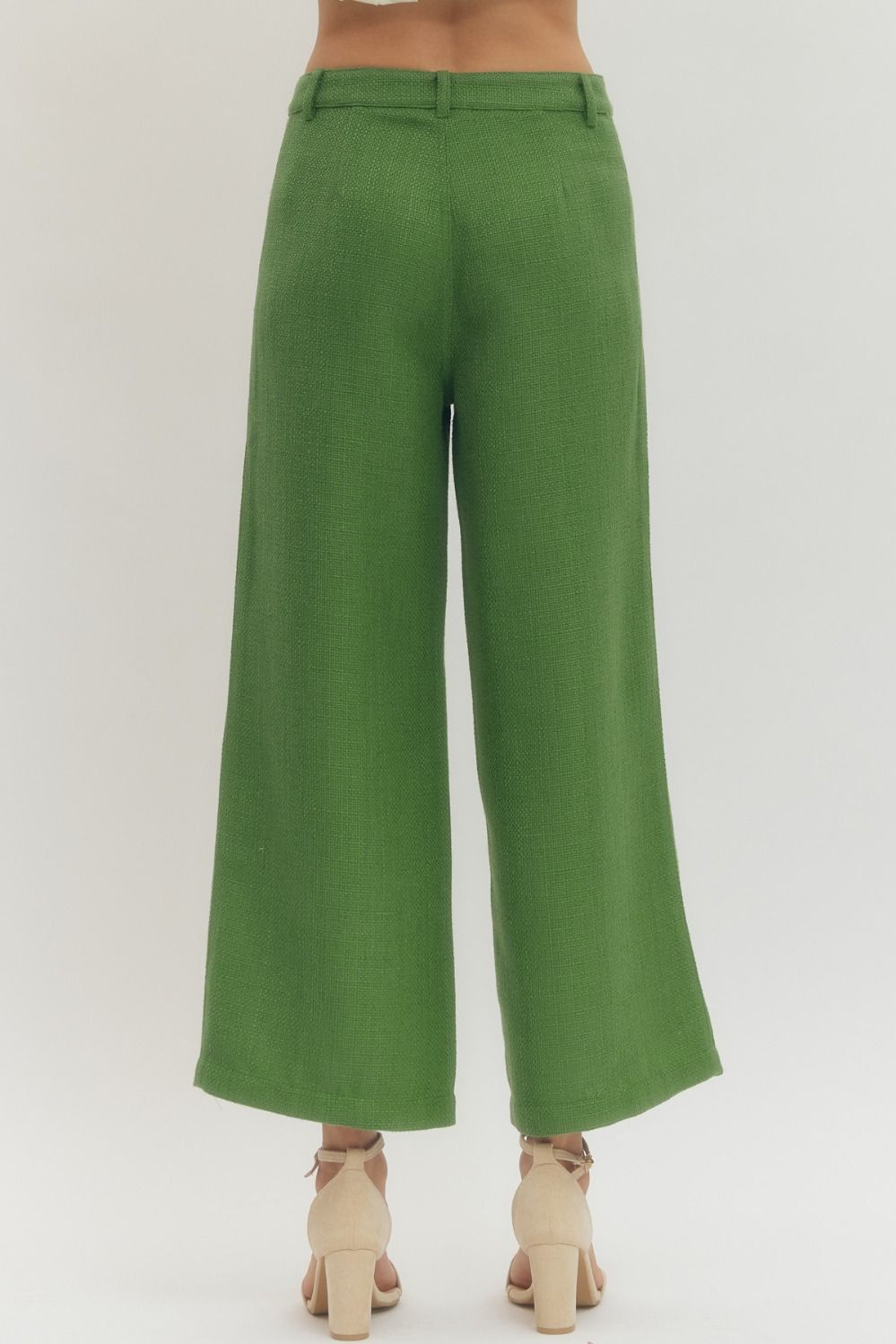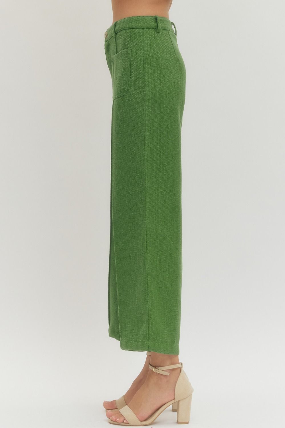 Chic and effortlessly polished, these textured green pants feature a flattering high-rise fit with a modern wide-leg silhouette. Front patch pockets and clean seam details add a stylish touch, making them perfect for both work and weekend wear.