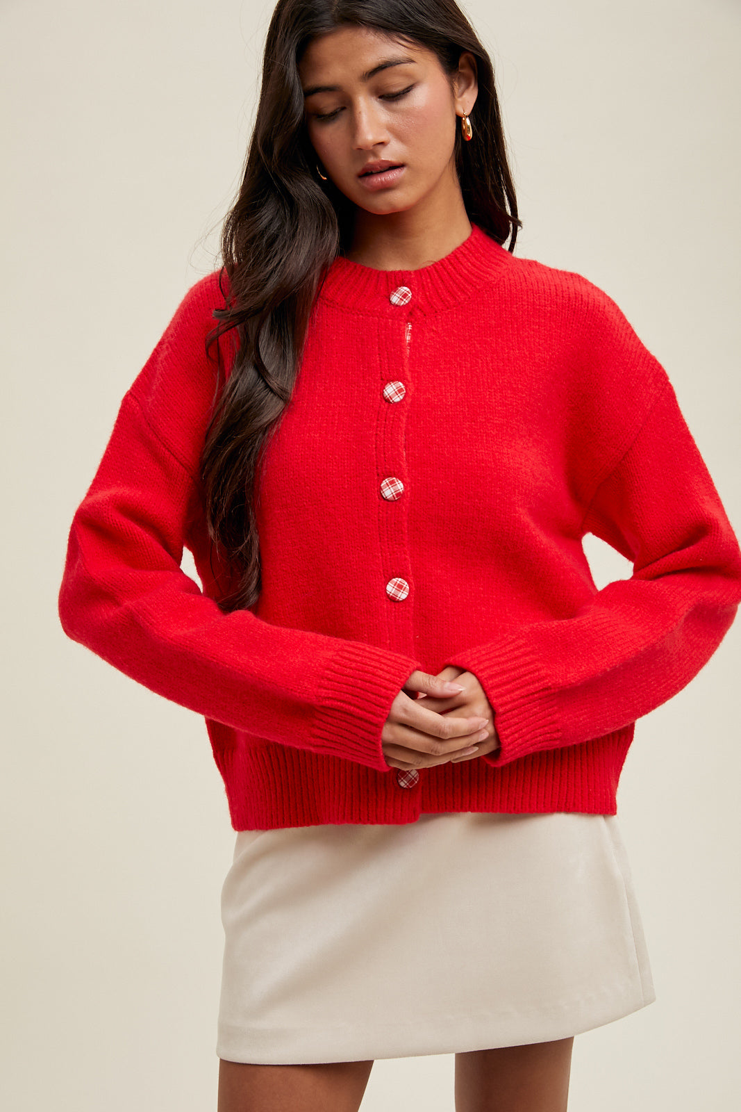 Cozy meets playful in the Marnie Button Cardigan, featuring a soft knit body, plaid-pattern buttons, and a relaxed fit. Perfect for layering or adding a bold pop of cherry red to your look.