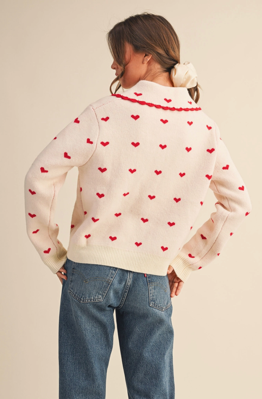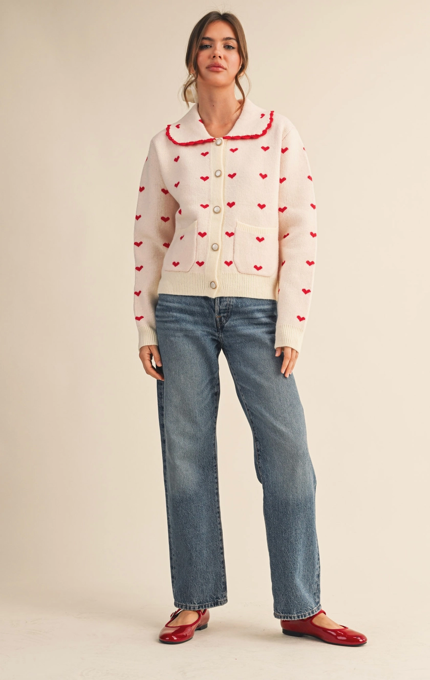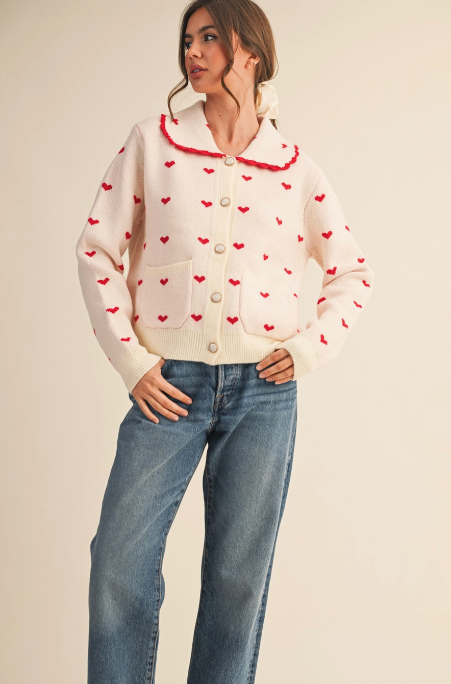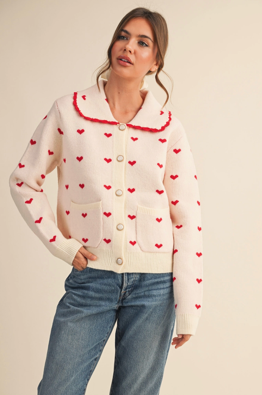 A cozy, feminine cardigan featuring an allover heart pattern and scalloped collar with contrast trim. Designed for easy layering or wearing on its own.