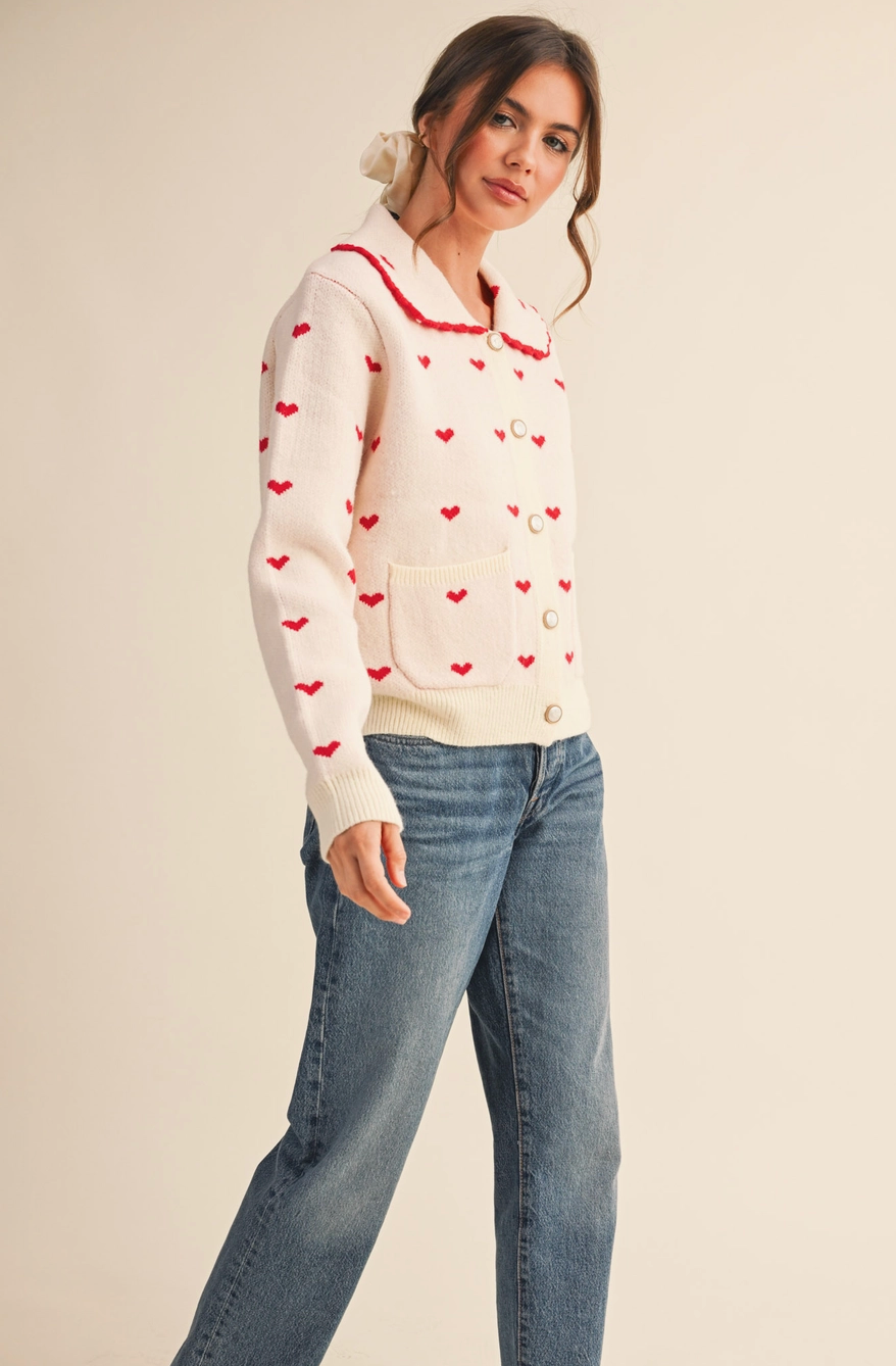 SWEETHEART KNIT CARDIGAN IN IVORY AND RED