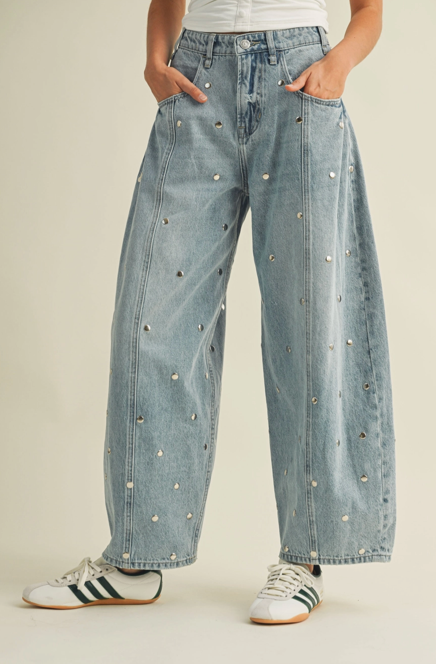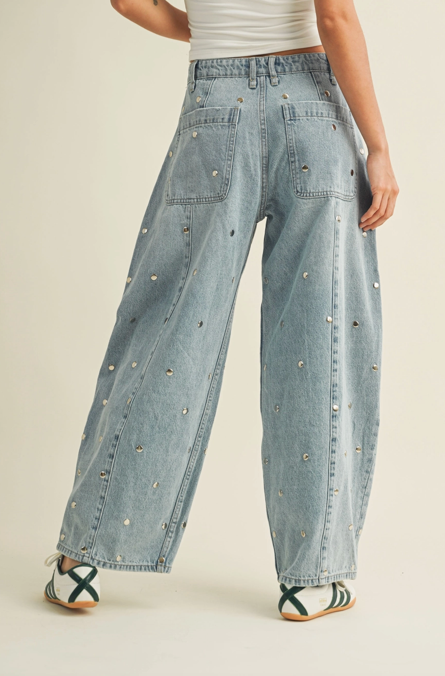 STUDDED BARREL JEANS IN LIGHT DENIM