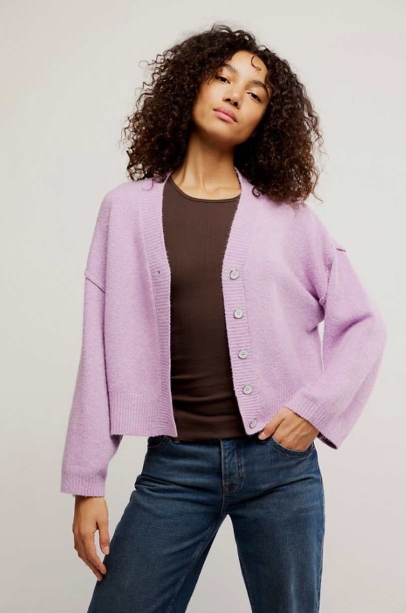 Brighten your layering lineup with the Cool of the Night Cardigan in soft lilac. Featuring a cropped length and slouchy silhouette, this cozy knit brings an easygoing vibe with just the right pop of color. Designed with a deep V-neckline, drop shoulders, and ribbed trim, it’s finished with a row of simple button closures for a classic touch. Equal parts playful and versatile, it’s the cardigan you’ll be reaching for again and again.