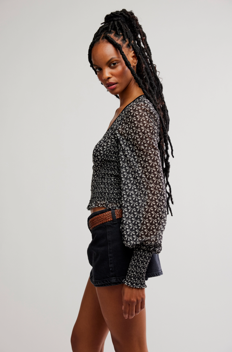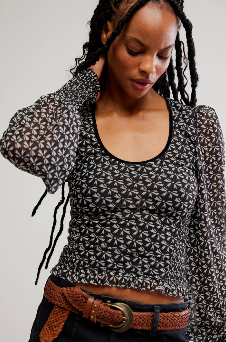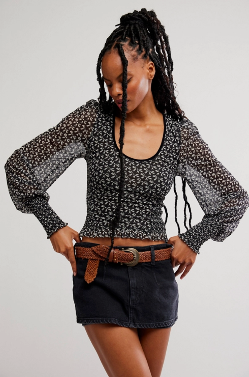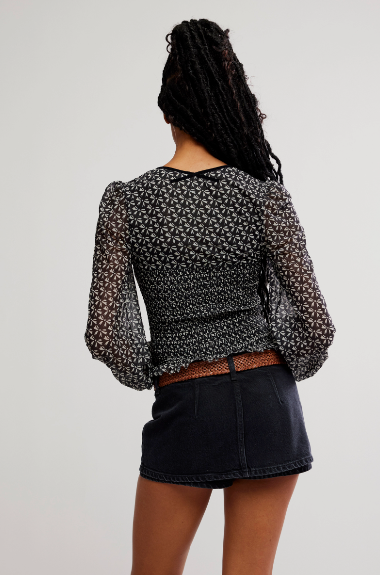 A romantic, vintage-inspired silhouette with a modern Free People feel. The Dottie Knit Top features a sheer patterned knit with a flattering scoop neckline and softly puffed long sleeves. Smocked through the bodice for a close, comfortable fit, this top hugs in all the right places while offering just the right amount of stretch. Feminine, effortless, and endlessly versatile, it’s a standout piece you can dress up or down.
