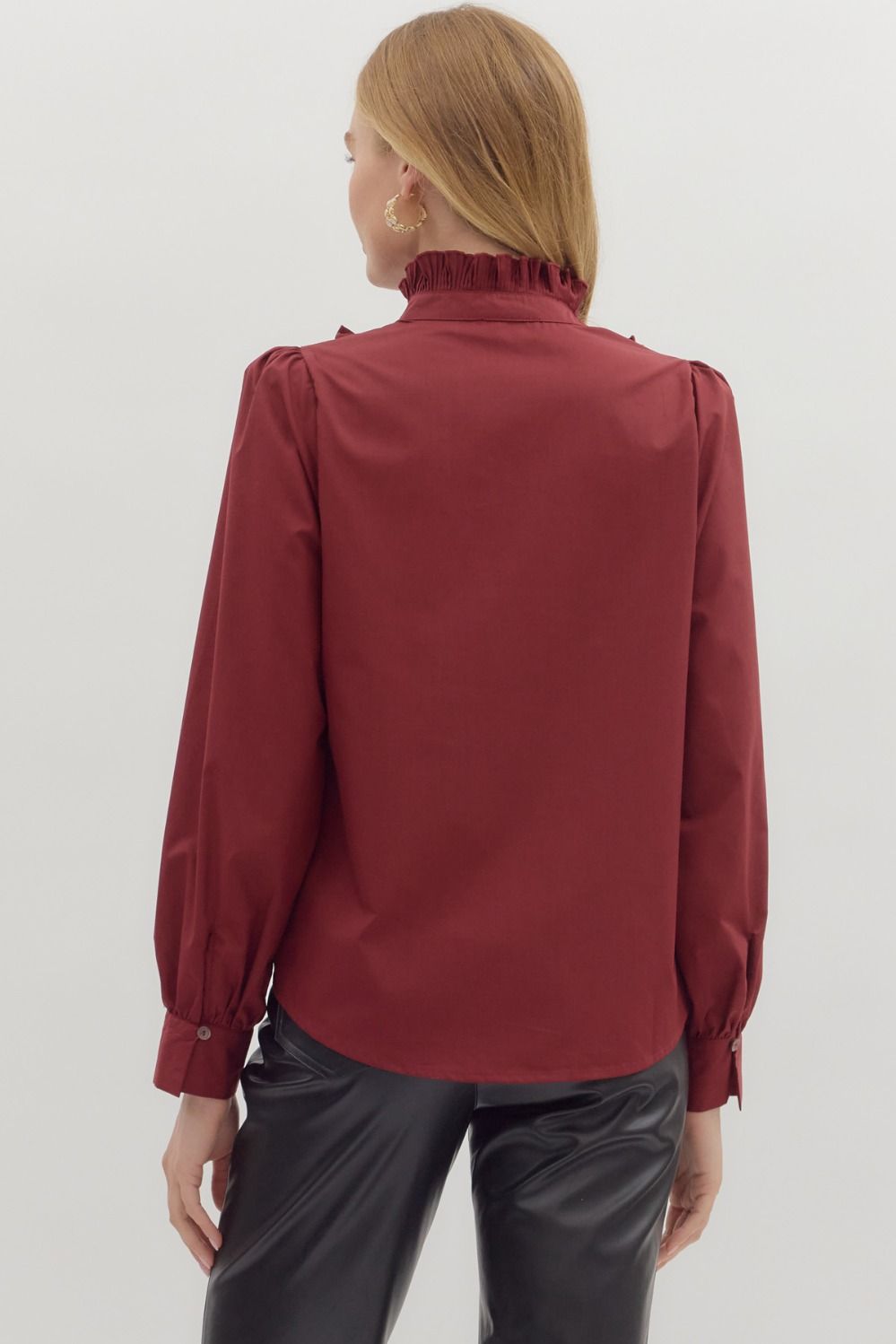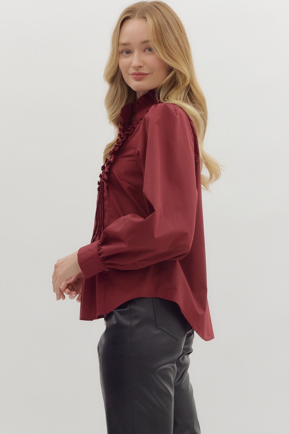 Sophisticated yet bold, the Ivy Blouse in rich merlot features a high ruffled neckline and pleated front framed by delicate ruffle trim. The voluminous sleeves with buttoned cuffs add soft structure, while the relaxed fit creates an effortlessly polished silhouette.