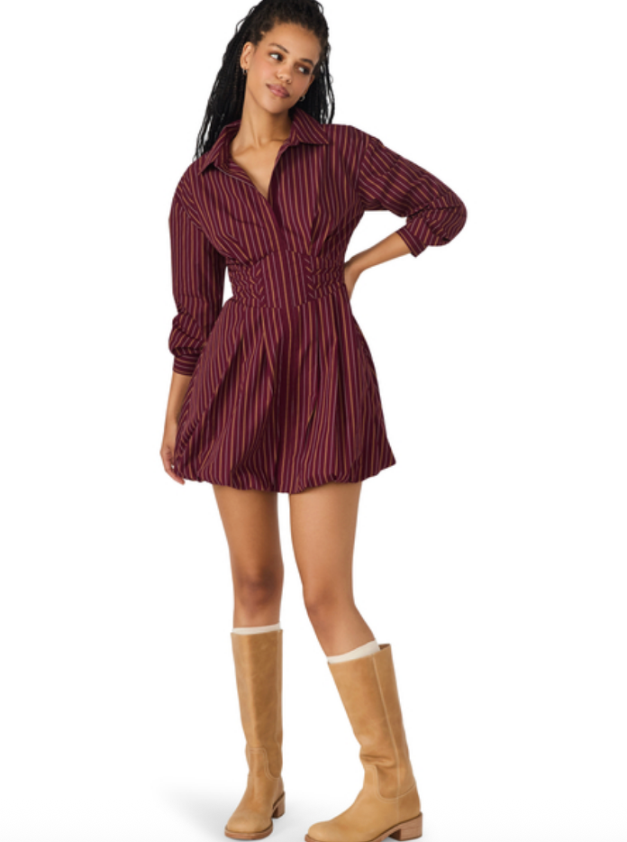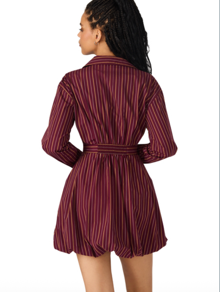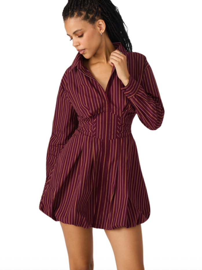 Bold, flirty, and made to turn heads—the Arielle Dress in Wine Stripe by Steve Madden brings a crisp edge to feminine styling. Featuring a structured shirt collar, flattering cinched waist, and bubble hem mini skirt, this button-up dress delivers a modern twist on prep-school tailoring with playful proportions.