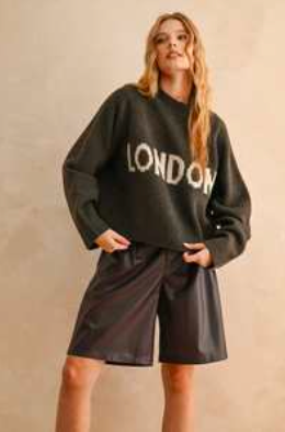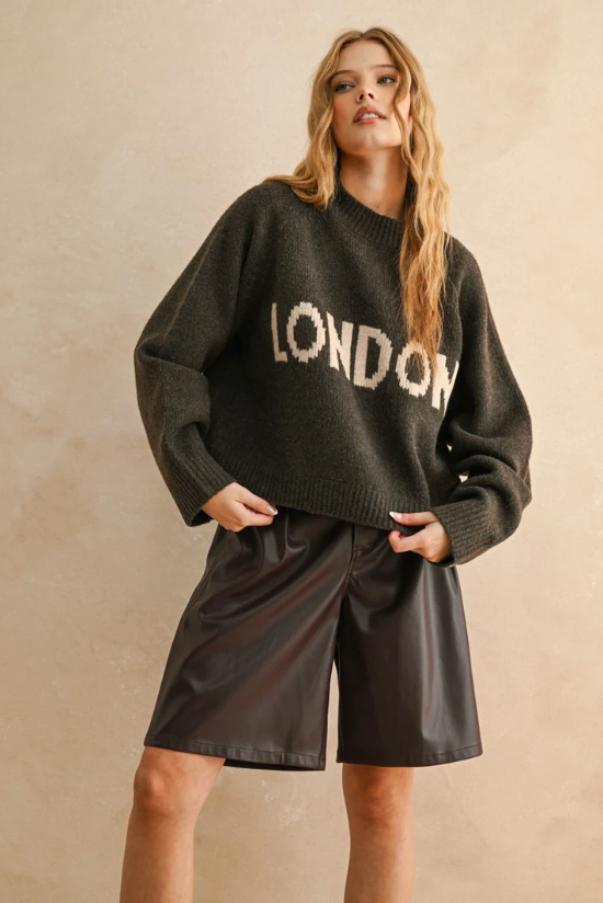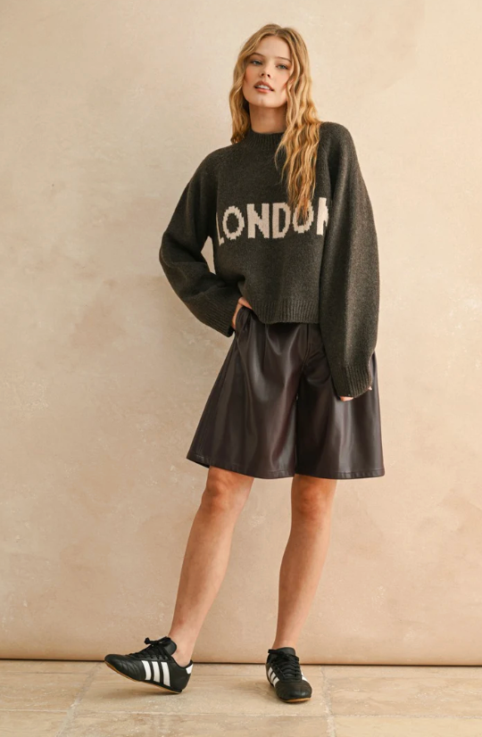 Cozy with a cool-girl edge — the London Sweater is your new statement knit. Featuring an oversized, relaxed fit with a bold “LONDON” graphic across the front, this soft brown sweater gives effortless model-off-duty vibes. Dress it up with faux leather, or keep it casual with denim and sneakers.