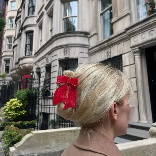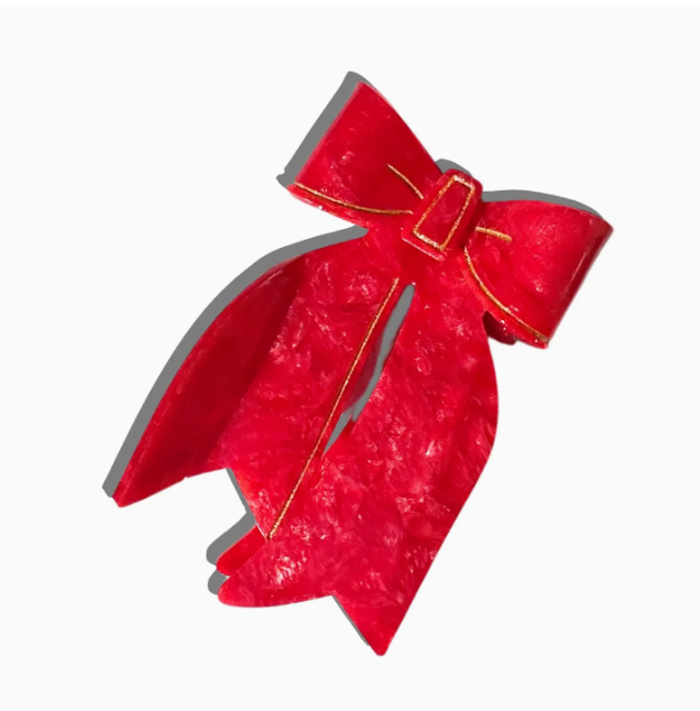Add a playful pop to your updo with this vibrant hand-painted red bow claw clip. Shaped like a cascading ribbon and finished with golden edge detailing, this bold accessory brings a festive flair to buns and ponytails alike. Durable yet darling, it's perfect for holiday parties, date nights, or simply brightening up your daily look.