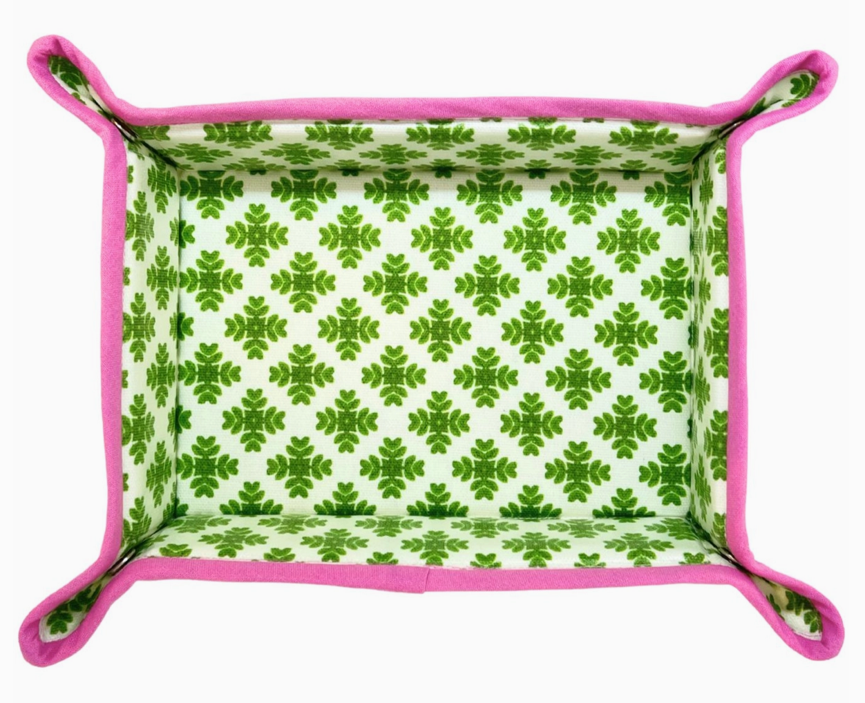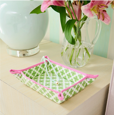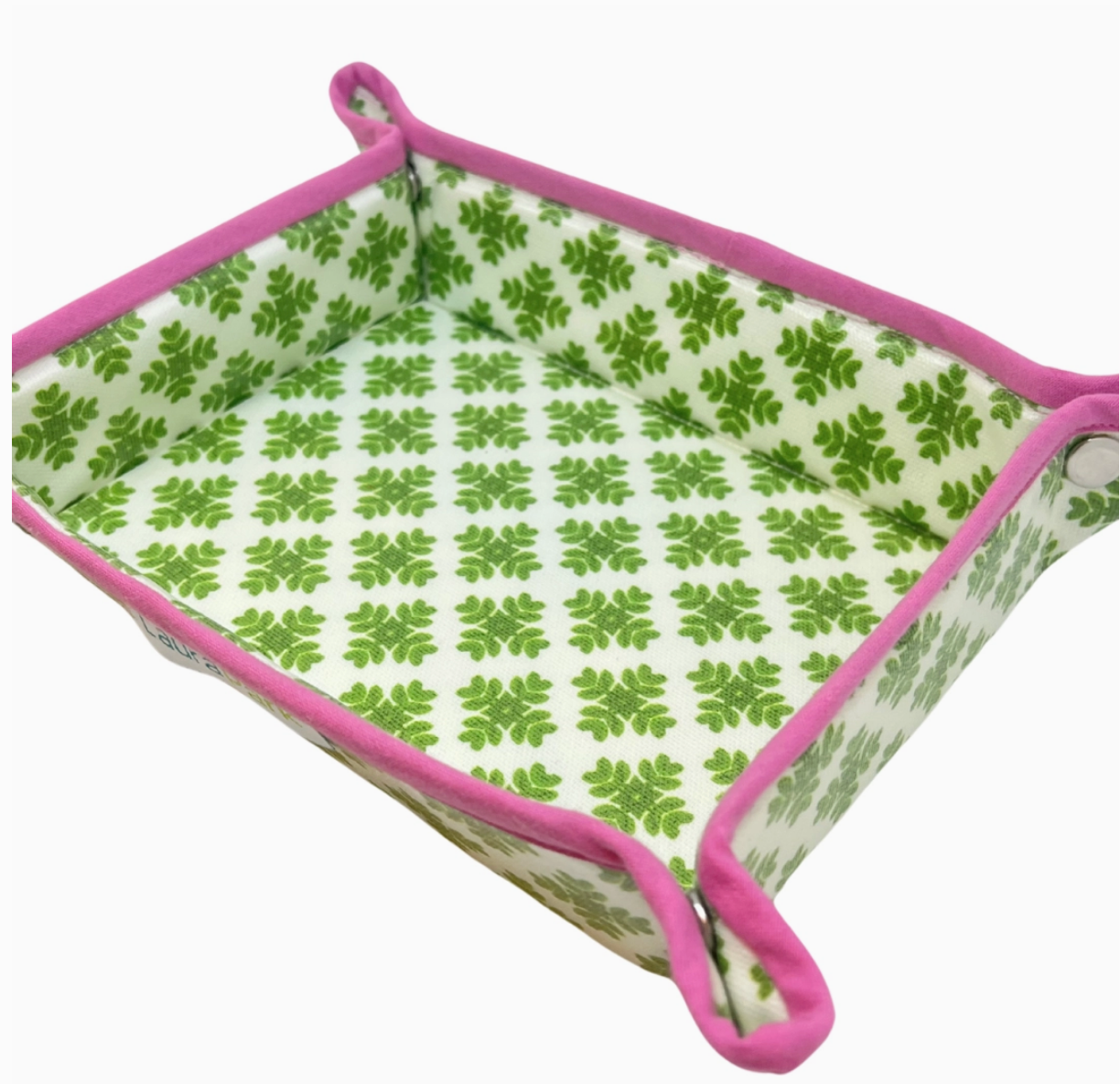 Pretty meets practical in this charming Brushstrokes Snap Tray—a stylish solution for keeping your favorite pieces in place. Featuring a vibrant green block-printed floral motif and trimmed in cheerful pink, this soft-structured tray snaps up in seconds for effortless organization.