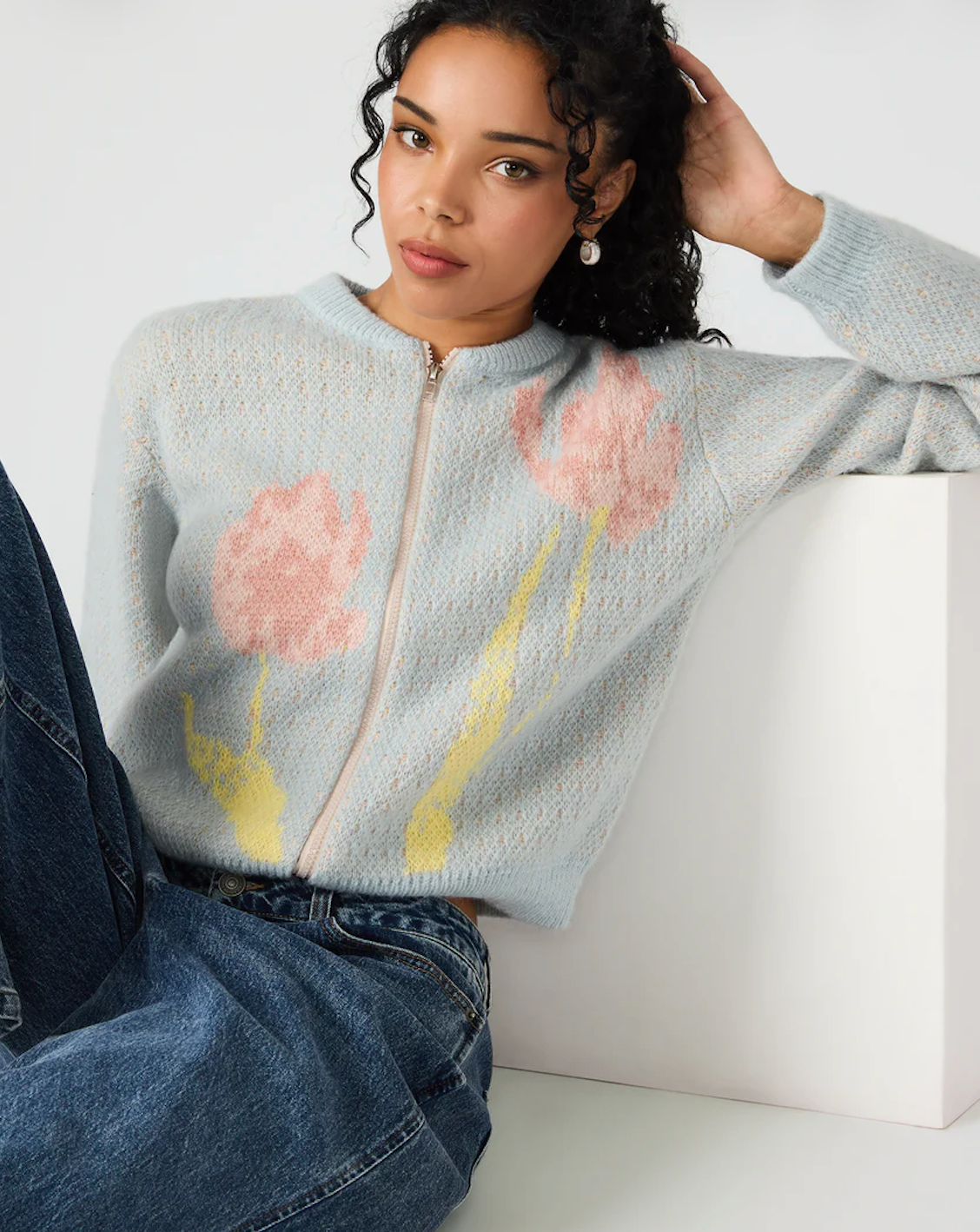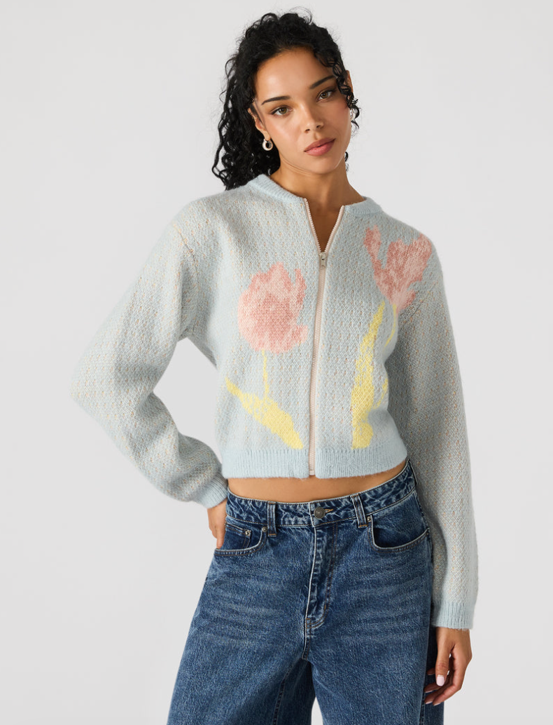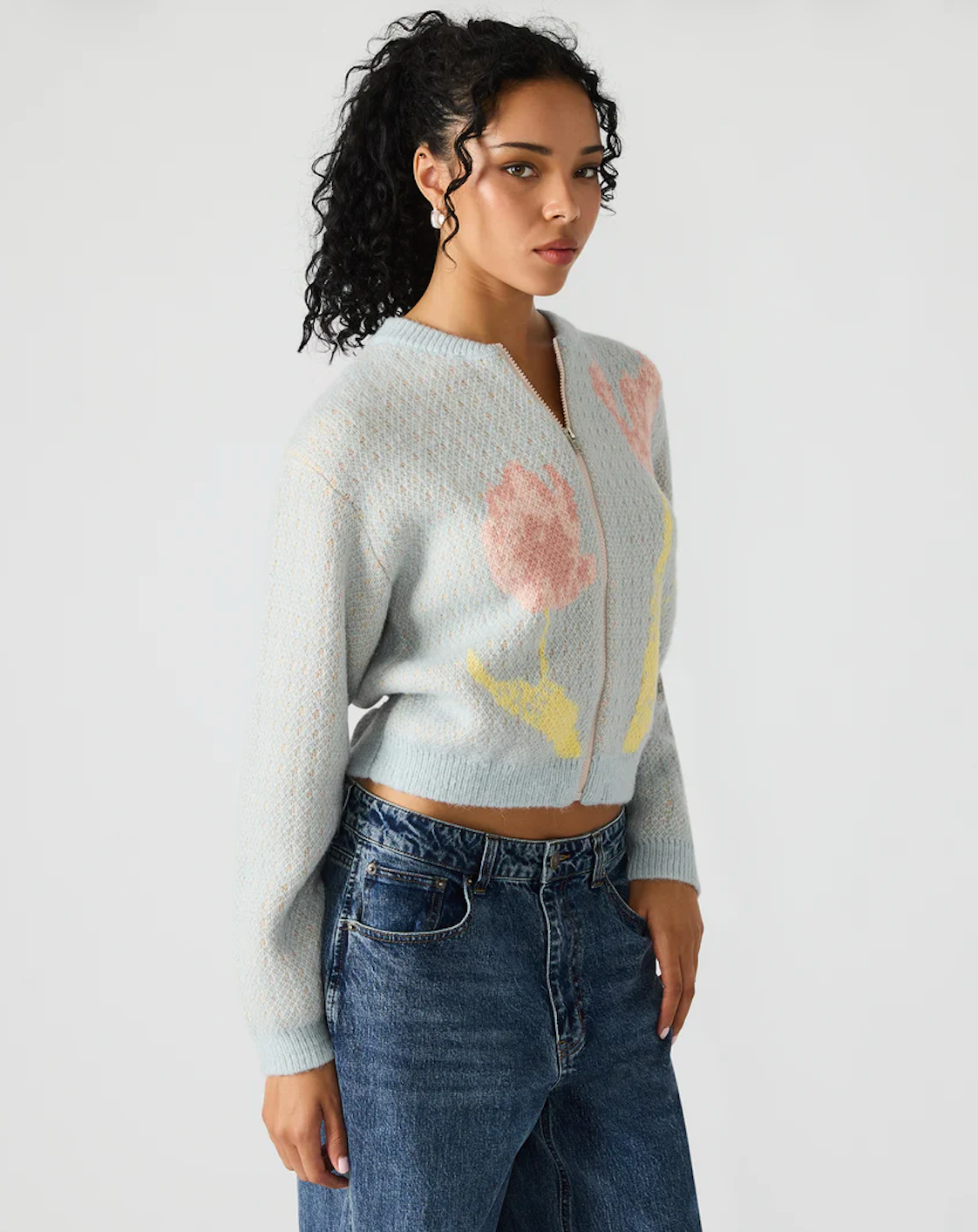 A cropped knit jacket in soft sage with a zip-front closure and subtle floral detailing. Lightweight with a cozy feel, this easy layer adds a touch of charm to everyday denim looks.