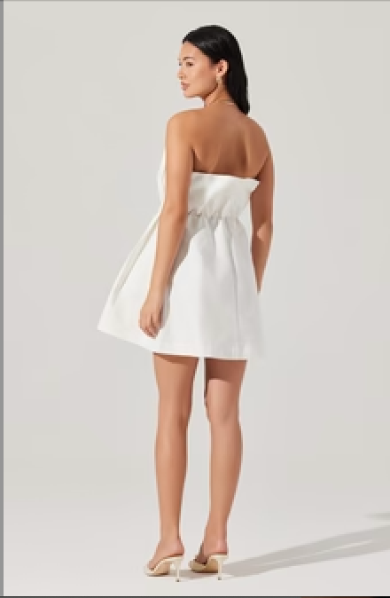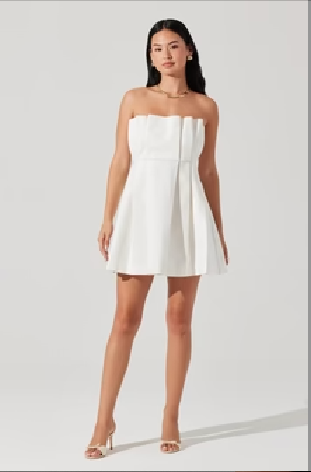 Make a sleek and sophisticated statement in the ASTR Clemira Pleated Mini Dress in White. Crafted with modern minimalism in mind, this strapless mini dress features a structured pleated neckline that adds architectural interest to the clean silhouette. The fitted bodice flows into a subtly flared skirt with a front box pleat, creating movement and dimension with every step. An invisible back zipper and inner grip lining ensure a secure fit. Whether you're headed to a summer soirée, bridal event, or rooftop dinner, this crisp white number pairs perfectly with strappy heels and bold accessories.