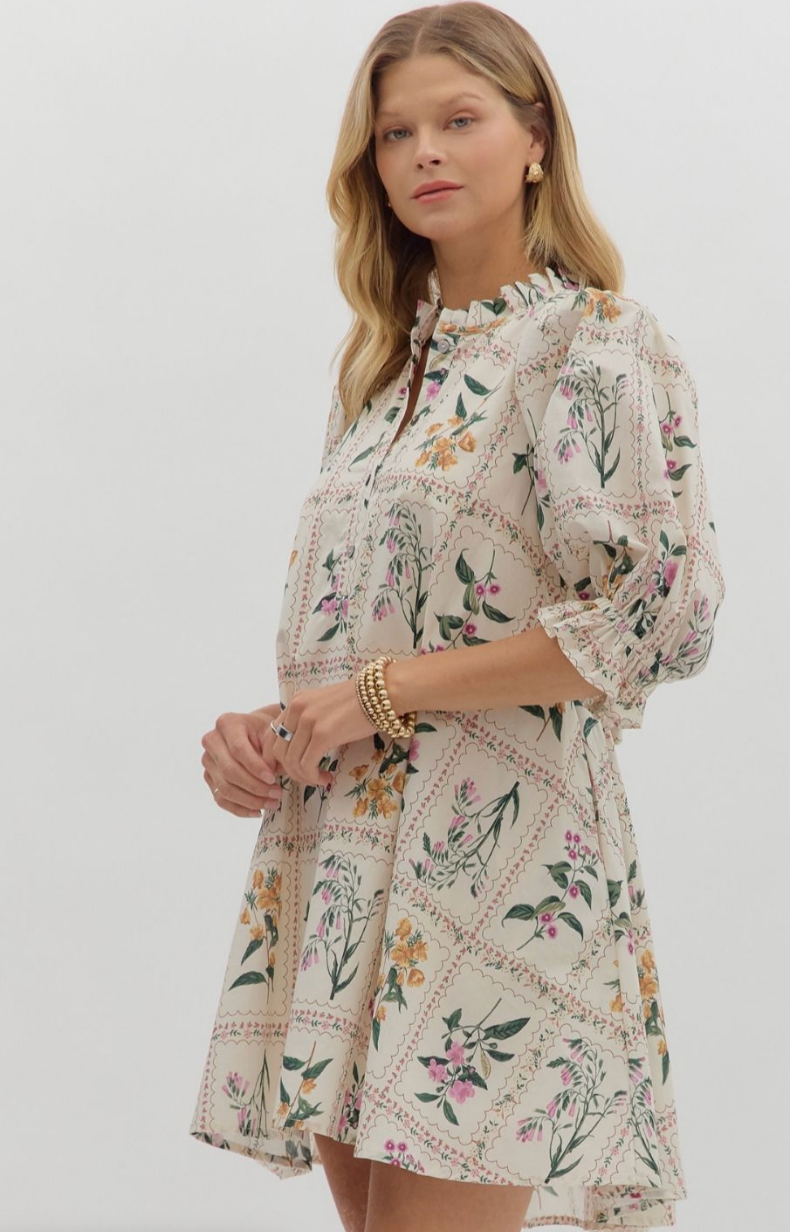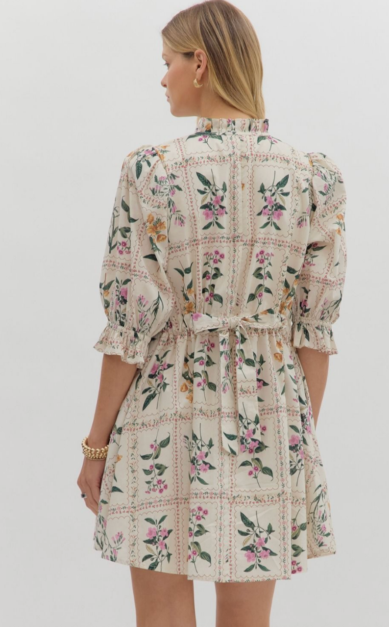 Sweeten your day with the Pressed Petals Mini Dress, a vintage-inspired beauty blooming with garden charm. Framed with a soft ruffled collar and puff sleeves, this cream-toned stunner features a playful floral patchwork print that brings retro elegance into the present.