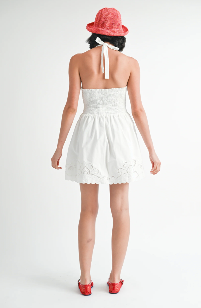 Fresh, flirty, and timelessly feminine, the Winona Mini Dress is your go-to piece for warm-weather days and chic getaways. Designed in crisp white cotton, this halter mini features a scalloped V-neckline, smocked back, and cinched waist for a flattering fit. The eyelet embroidery along the hem adds a playful, romantic touch to its breezy silhouette.