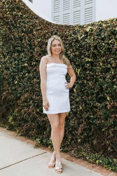 Flirty, fresh, and perfectly polished—the Angelina Mini Dress is your go-to for sweet celebrations and sunny-day soirées. This strapless stunner features a structured silhouette with a feminine bow detail that adds just the right amount of charm.