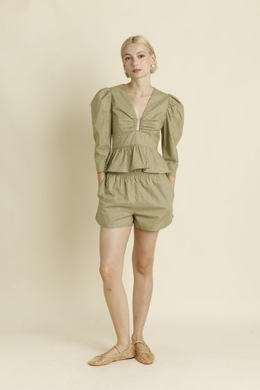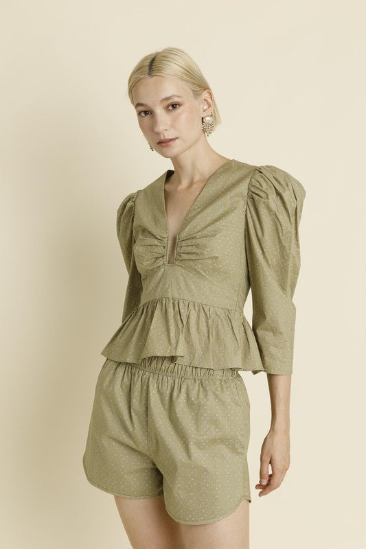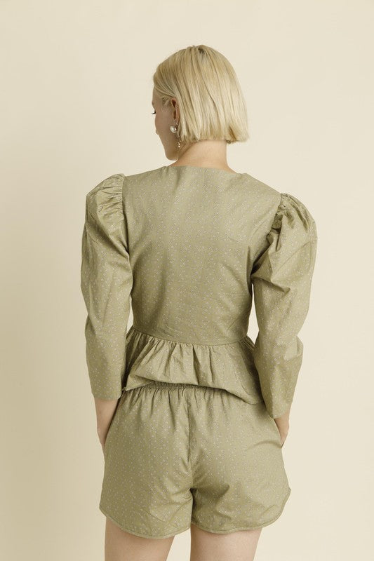 The Daisy Peplum Top is a sophisticated take on a classic feminine silhouette, blending vintage charm with modern elegance. Designed in a soft olive green hue with a delicate daisy print, this top features a deep V-neckline with a dainty keyhole cutout that adds a subtle hint of allure. The puffed three-quarter sleeves enhance the structured look, while the peplum waist provides a flattering, waist-defining shape.