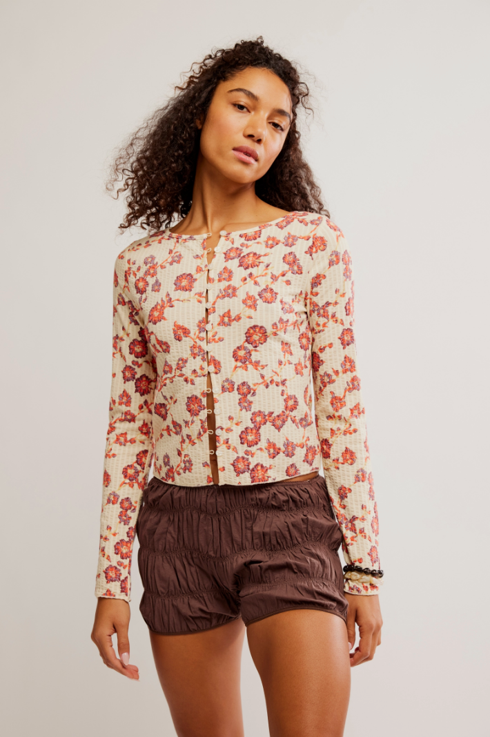 Romantic, vintage-inspired, and perfectly femme, the Tilly Long Sleeve top blends everyday comfort with standout floral detail. Designed in a soft waffle-knit texture with dainty, allover floral motifs, this flattering button-up features playful peekaboo loops at the placket and a body-skimming silhouette.