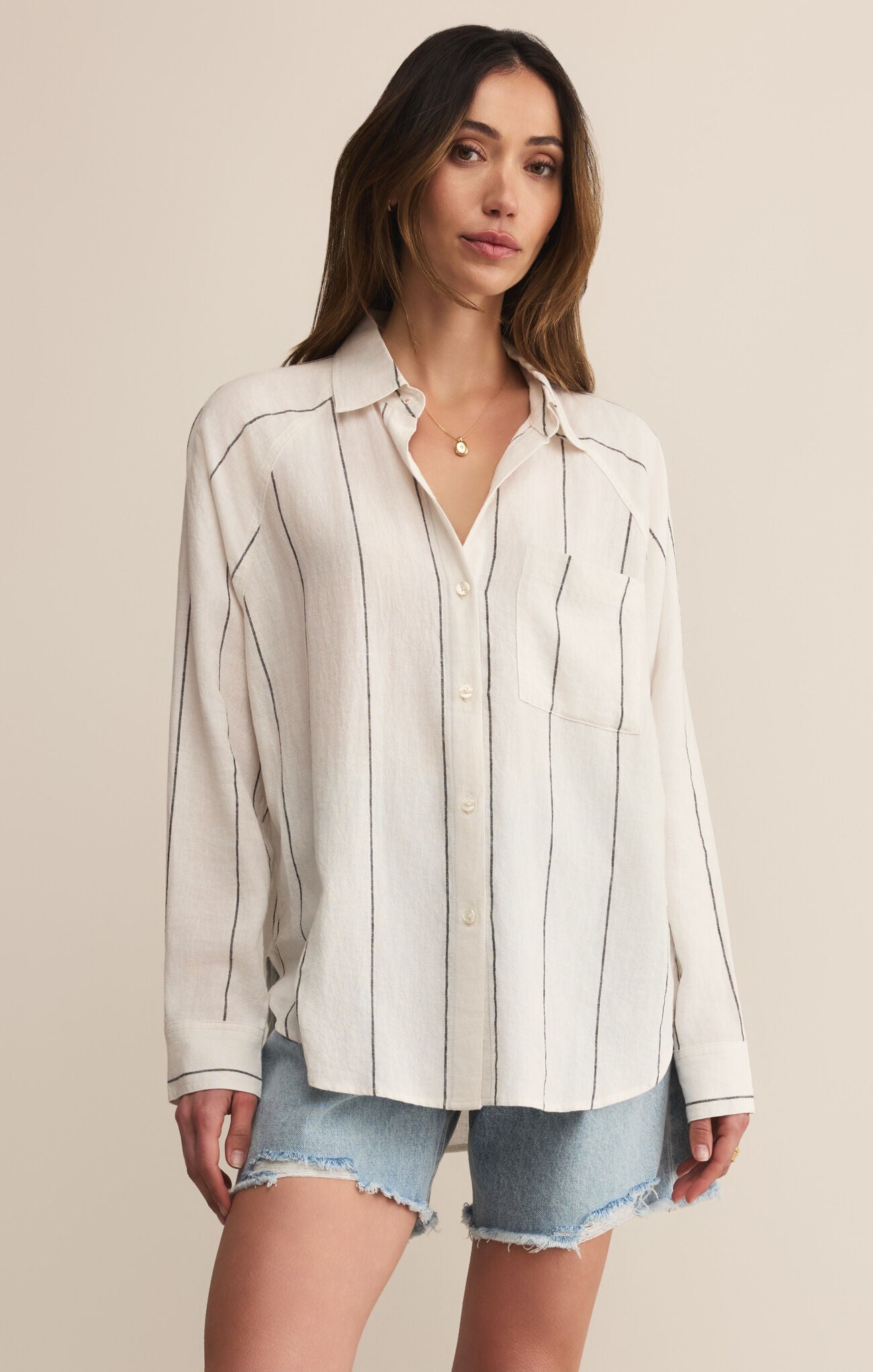 Effortlessly cool and endlessly versatile, the Perfect Line Top from Z SUPPLY is your new go-to for casual style. Featuring a relaxed fit with classic vertical stripes, this button-up shirt delivers breezy sophistication in a lightweight, woven fabric. The dropped shoulders and chest pocket add to its laid-back appeal, making it perfect for wearing tucked, tied, or layered over your favorite basics.