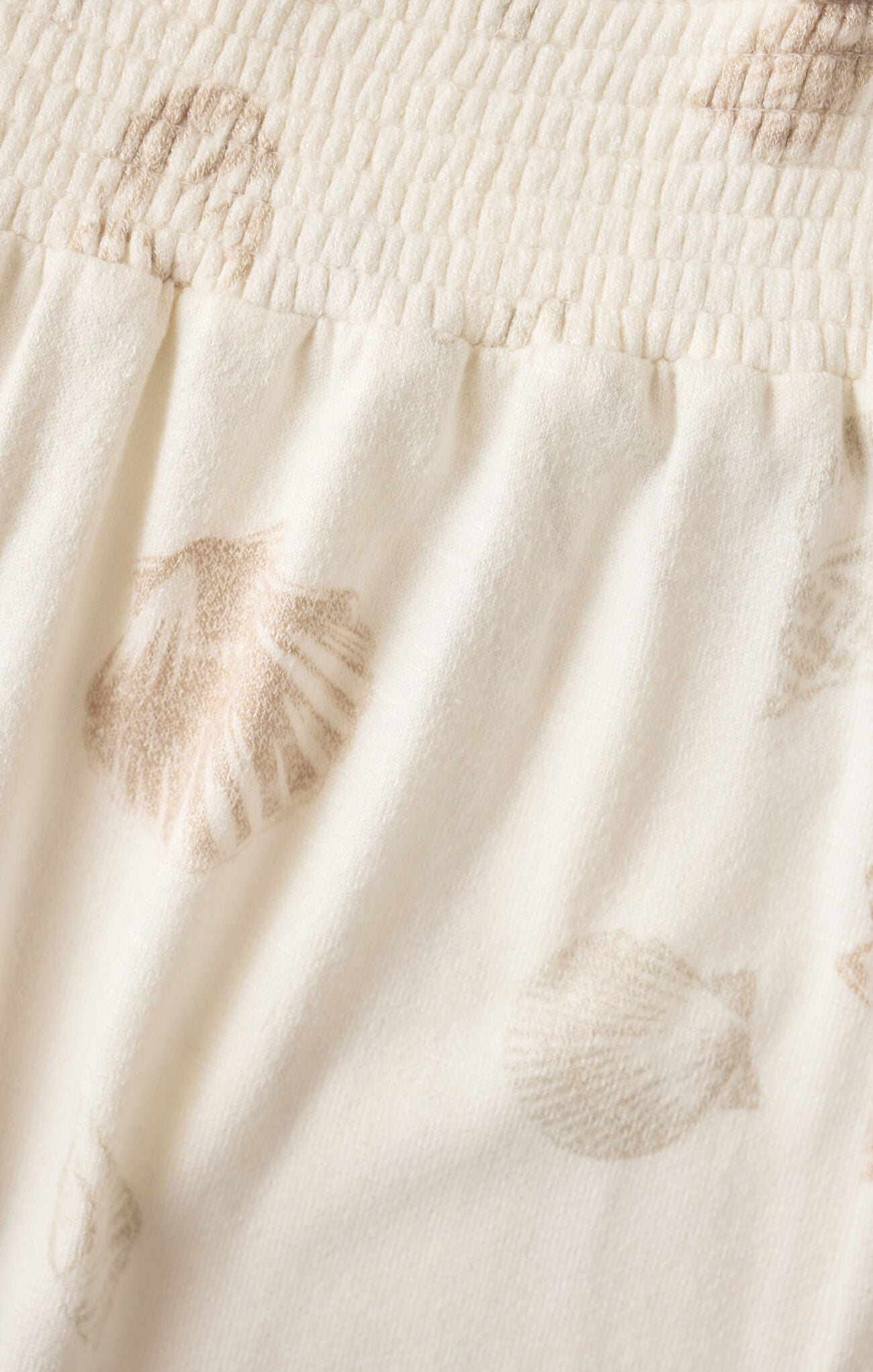 Easy, breezy, and made for slow mornings, the Dawn Shell Shorts bring coastal charm to your lounge lineup. Designed in a soft vanilla hue with a subtle seashell print, these lightweight shorts feature a comfy smocked waistband and relaxed silhouette for all day wearability. Perfect for pairing with the matching tank or your favorite cozy top.