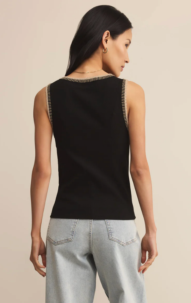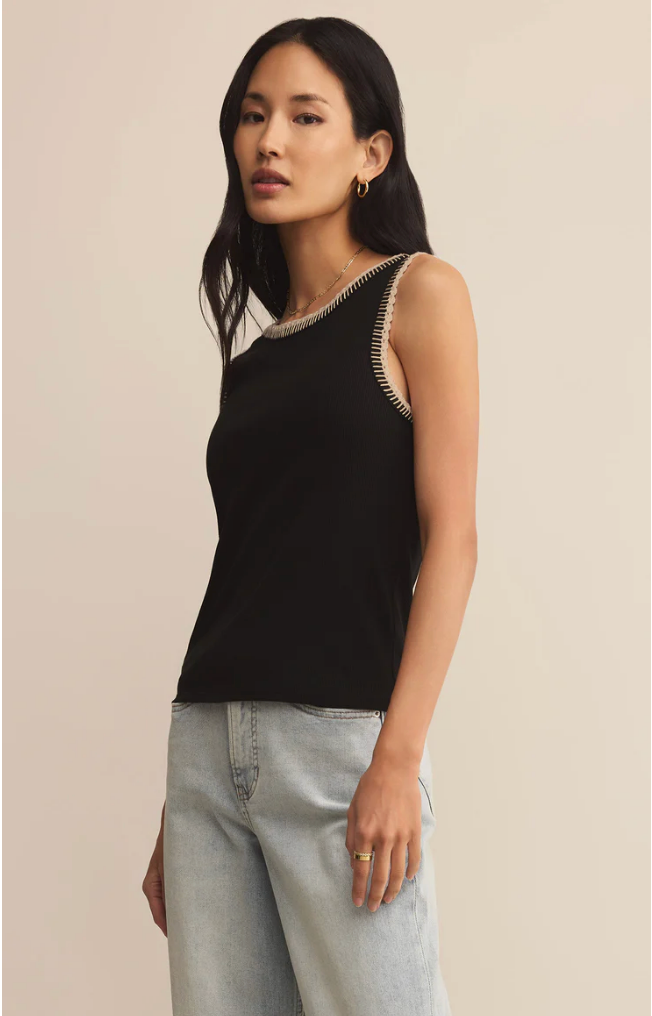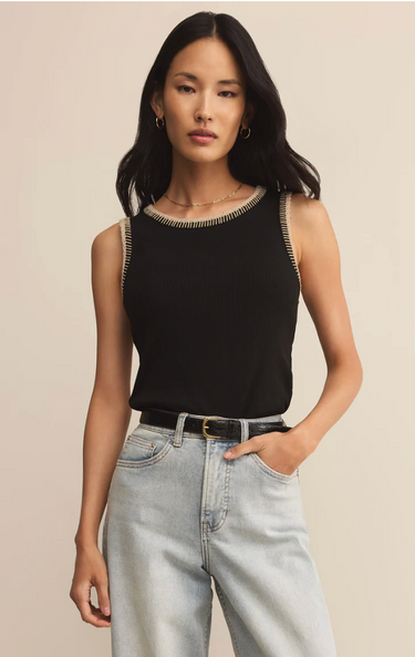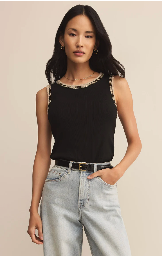 The Social Whipstitch Tank delivers classic structure with a modern twist. Featuring contrast whipstitch detailing at the neckline and armholes, this ribbed black tank adds subtle statement energy to your everyday essentials.