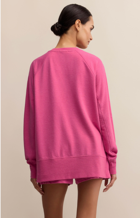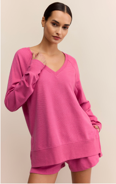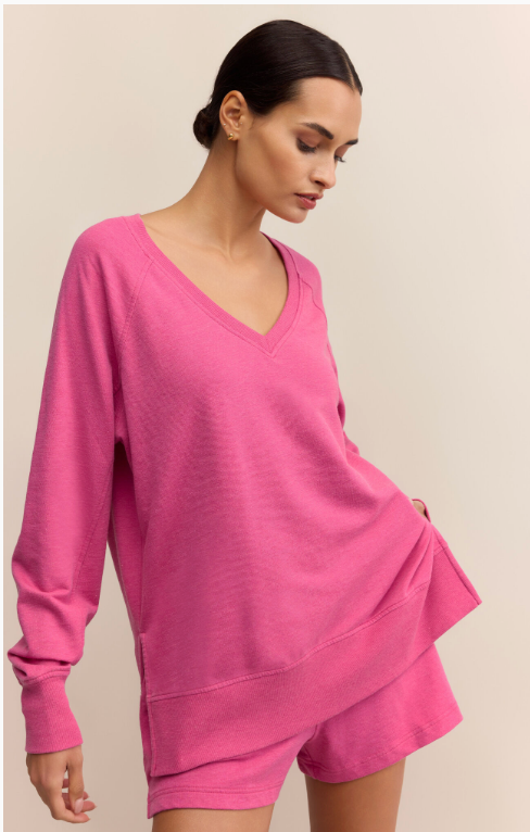 Bold color meets cozy comfort in the Weekender V-Neck Pullover, now in a vibrant Island Pink hue. This oversized staple brings laid-back lounge energy with a feminine twist, making it your new go-to for breezy mornings and off-duty days.