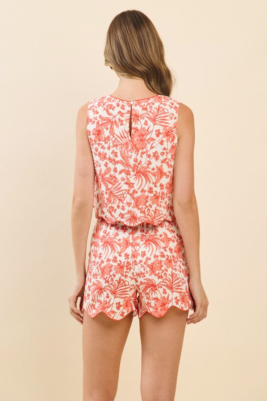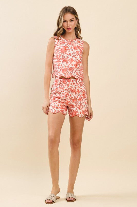 Say hello to summer in style with the Floral Print Scallop Set in Orange. This effortlessly chic matching set features a sleeveless blouse and high-waisted shorts adorned in a soft, botanical floral print. With its delicate scalloped hems and breezy silhouette, this duo offers an elevated yet relaxed look perfect for warm, sunny days.