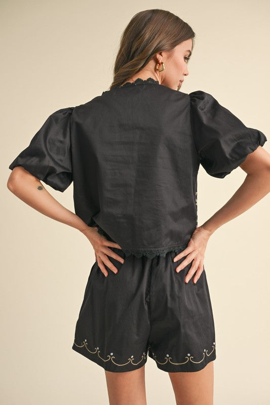 The Isabella Embroidered Set in Black is a statement-making two-piece that perfectly balances boldness with delicate charm. Designed in crisp black cotton, this airy set features an open-front tie blouse with scalloped embroidery, floral stitching, and puffed short sleeves for a romantic vintage touch. The matching high-waisted shorts are finished with a scallop-stitched hem and an easy elastic waistband for a flattering and comfortable fit.