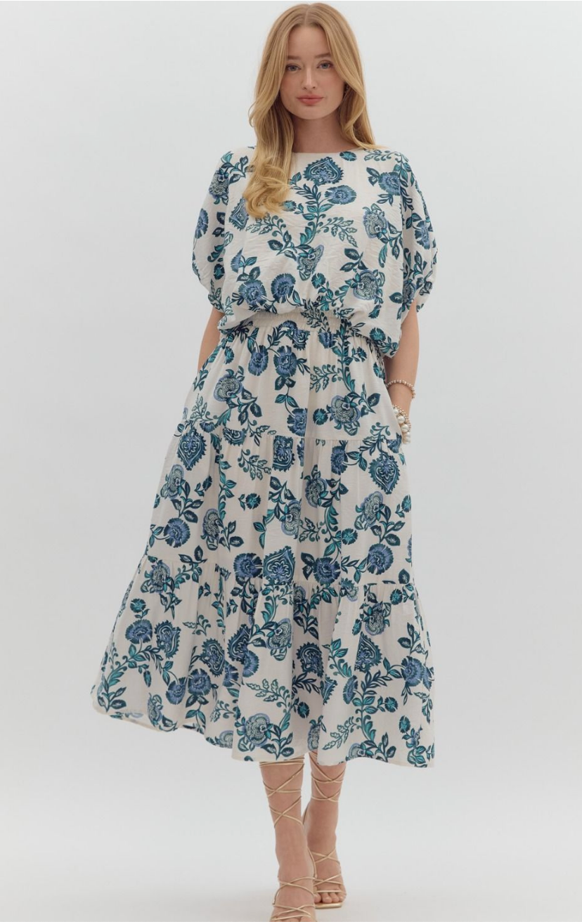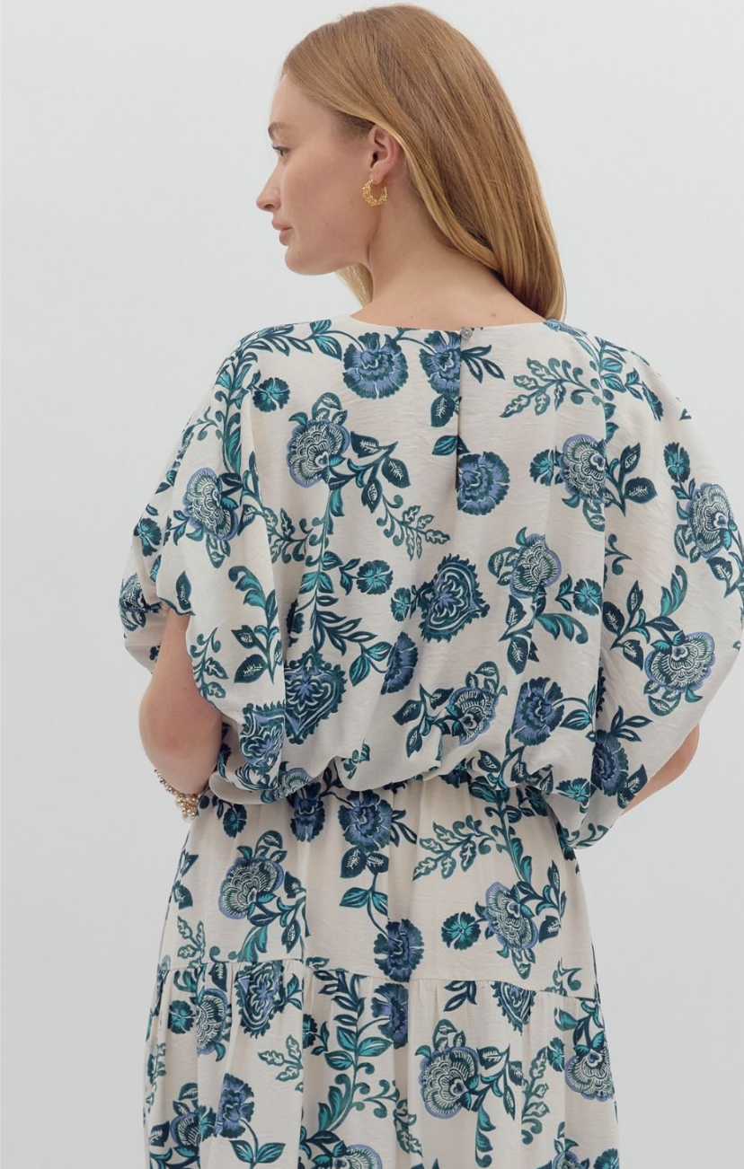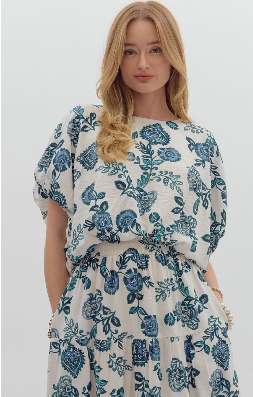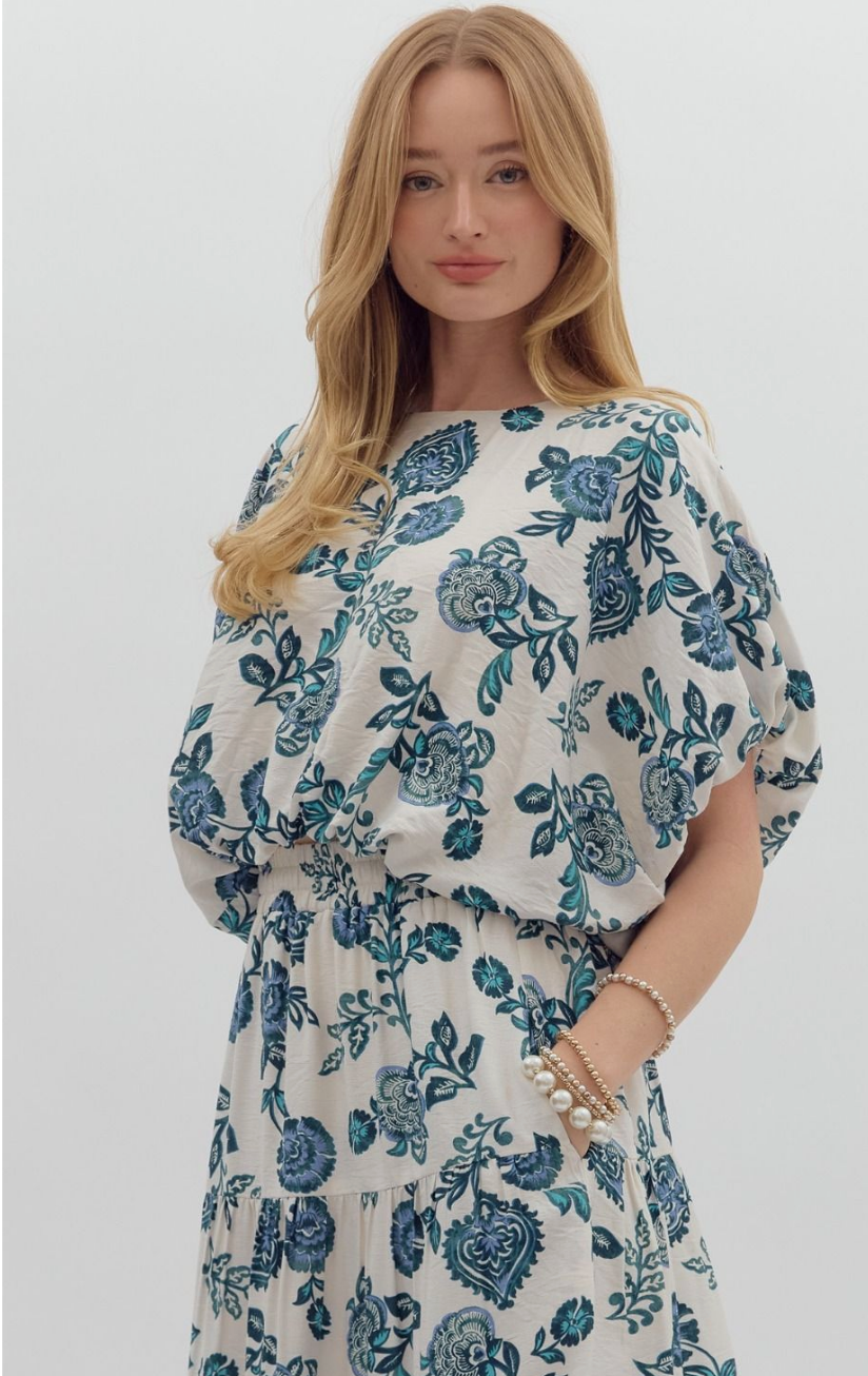 Step into effortless elegance with the Entro Teal Floral Print Top and Bubble Skirt Set. This matching ensemble features a breezy dolman-sleeve blouse and a flowy tiered midi skirt adorned in a sophisticated teal floral print on a cream background.