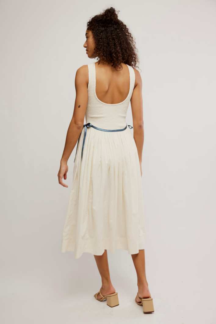 A graceful nod to vintage femininity, this effortlessly romantic midi is perfect for every soft Sunday or summer soirée. The stretchy smocked bodice hugs the figure comfortably, while the full skirt flows gently with every step.