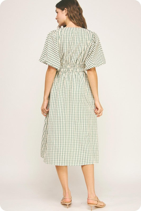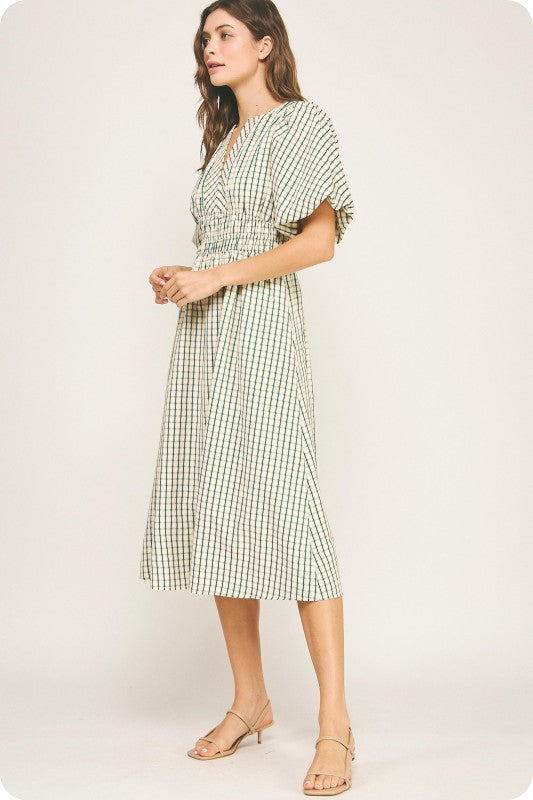 PLAID ELASTIC WAIST MIDI DRESS IN OATMEAL EMERALD