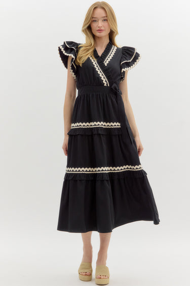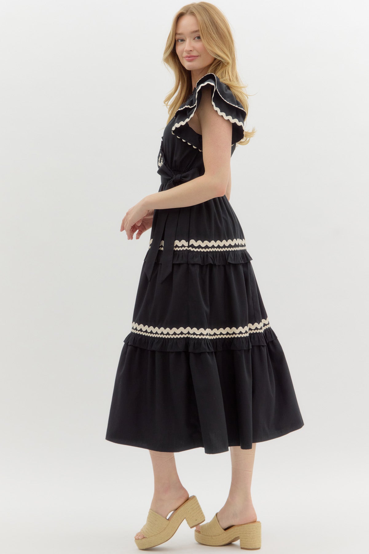 Elegant yet playful, the Montecito Ruffle Tiered Midi Dress by ENTRO brings effortless charm to your wardrobe. Crafted in a deep black hue, this midi-length dress features fluttery ruffle sleeves and a flattering V-neckline. Creamy scalloped trim adds a whimsical contrast across each tier and along the edges, highlighting its breezy, romantic silhouette. The adjustable waist tie provides a customizable fit, while the layered design adds volume and flow.