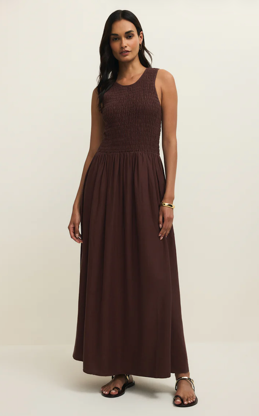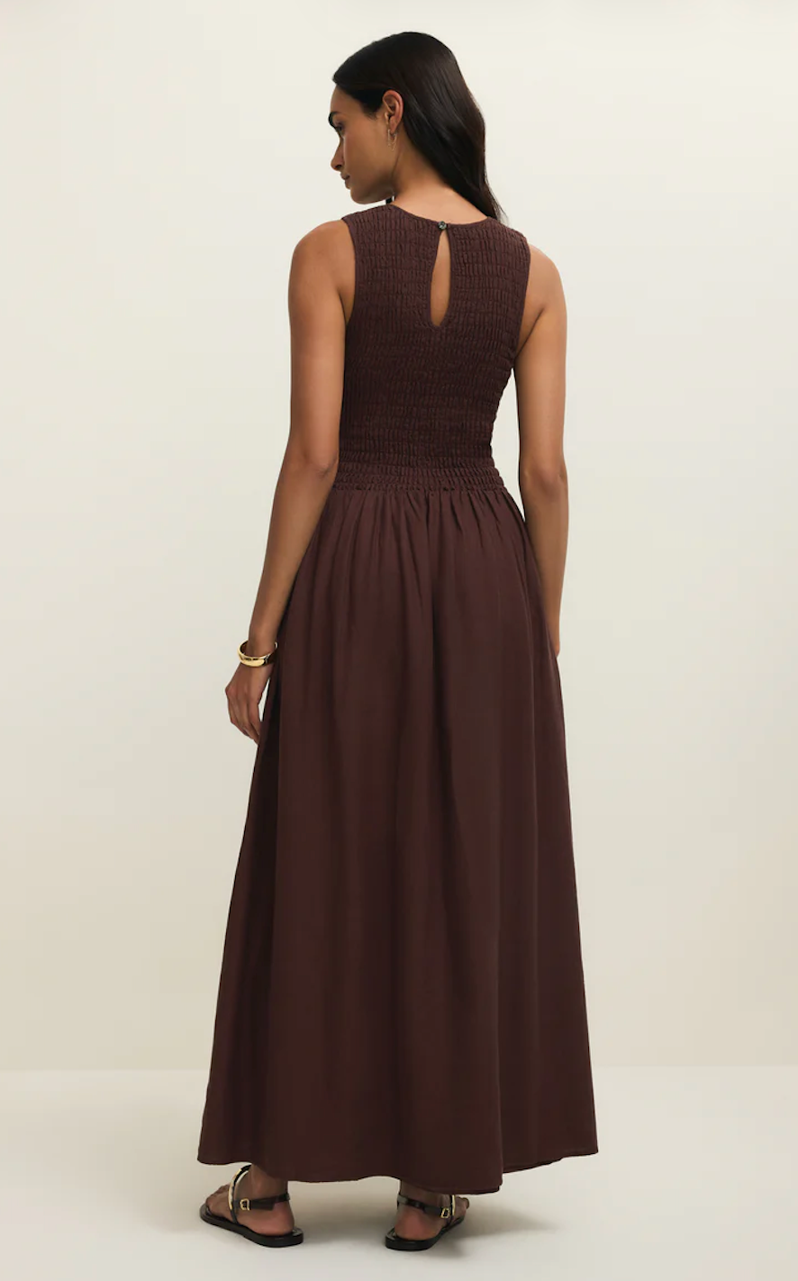 The Juniper Linen Maxi Dress is an effortless warm-weather staple in a rich chocolate cherry hue. Designed with a smocked bodice for a flattering fit, this sleeveless maxi flows into a relaxed, full-length skirt that moves beautifully with every step. The breathable linen blend keeps it light and comfortable, making it perfect for vacations, casual dinners, or everyday summer style.
