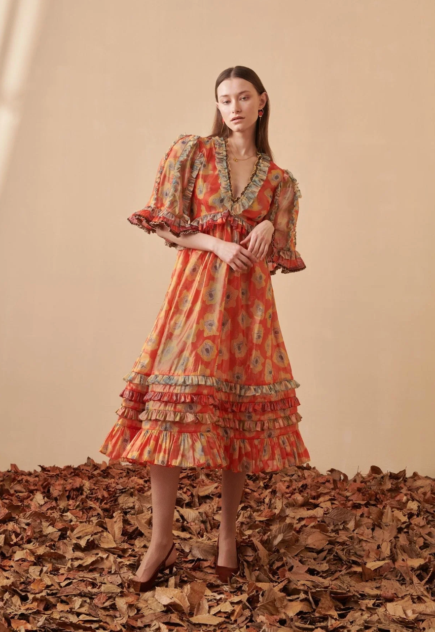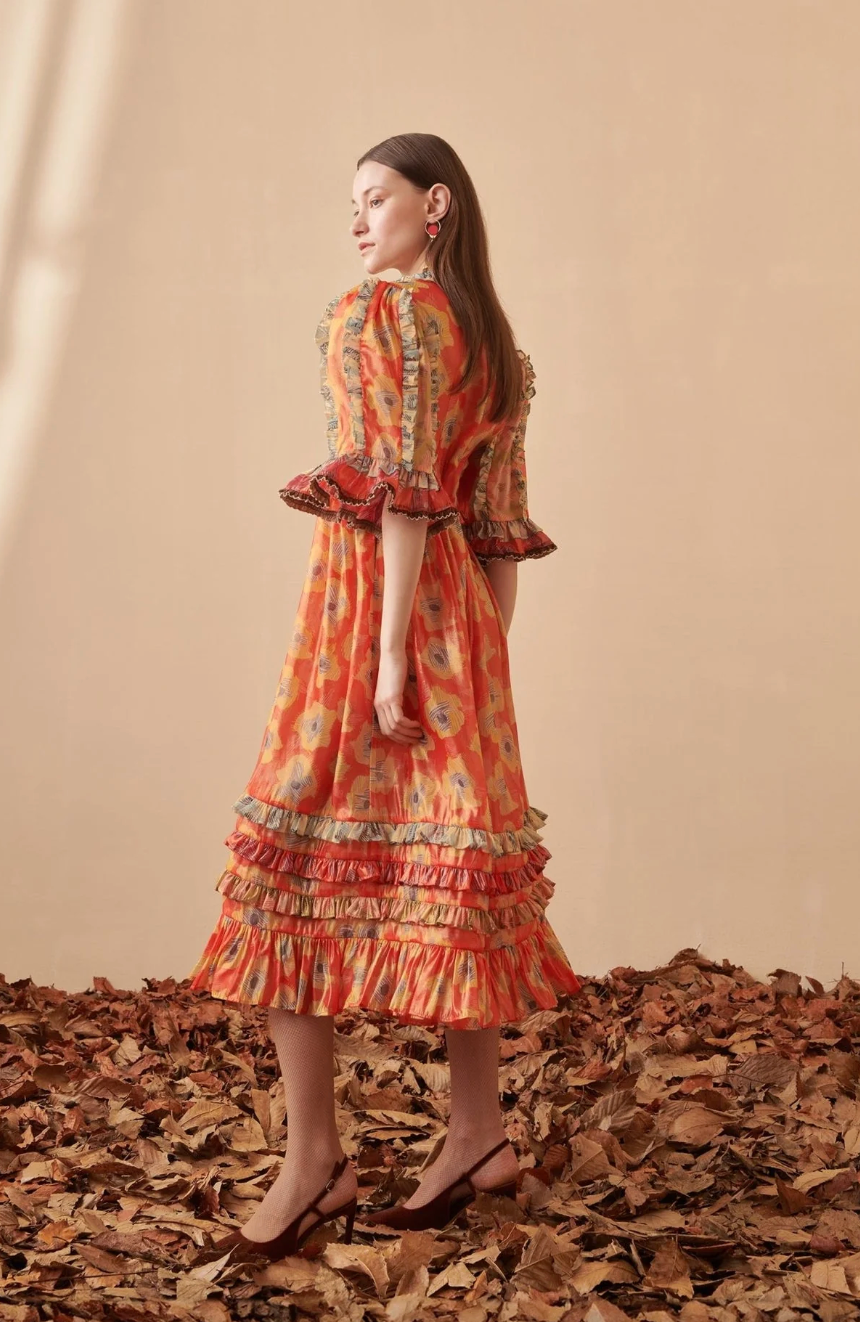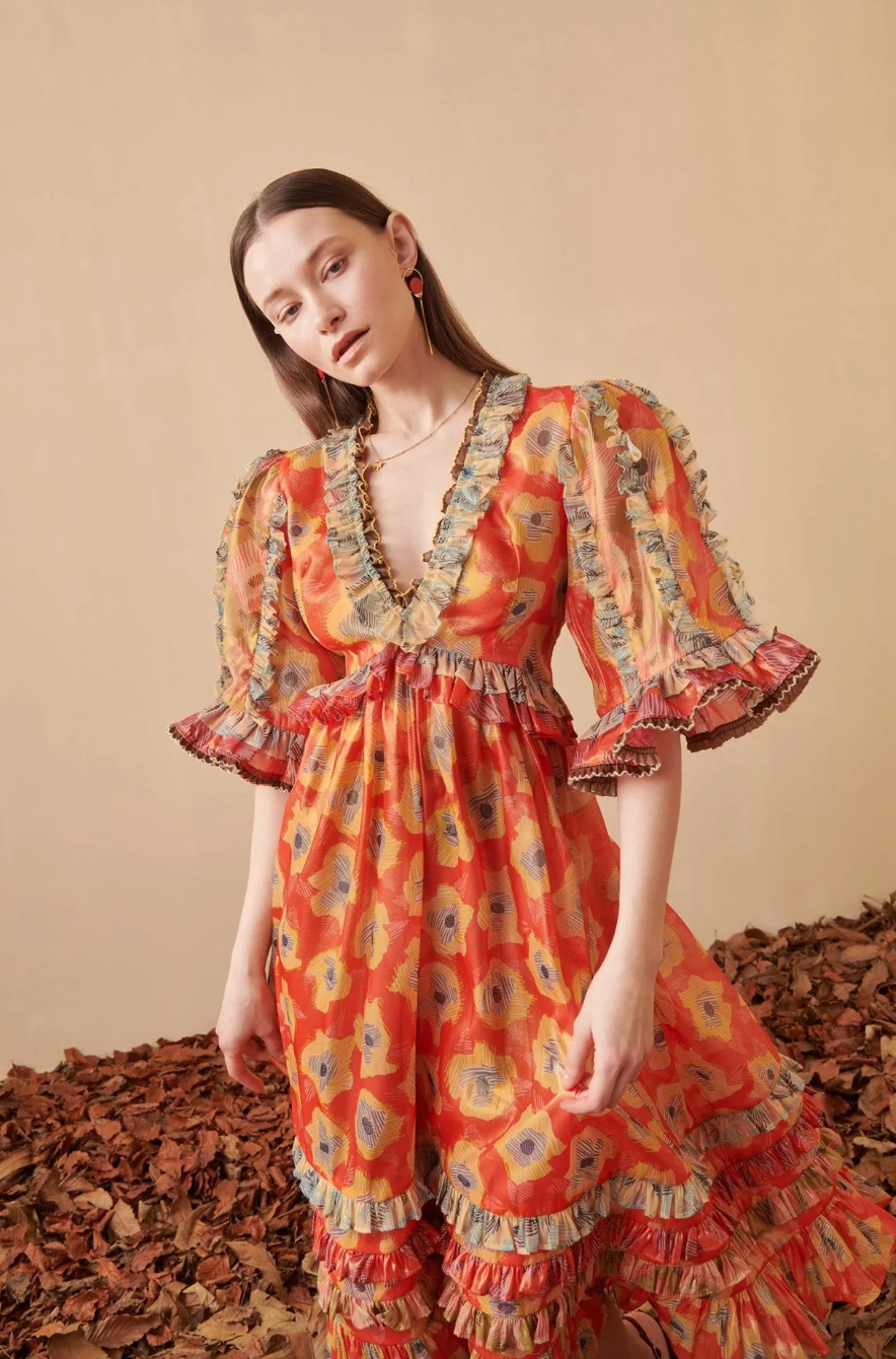 Bold, romantic, and full of movement. The Aura Midi Dress features a vibrant floral print, ruffled trims, sheer puff sleeves, and a tiered skirt for a stunning statement look.